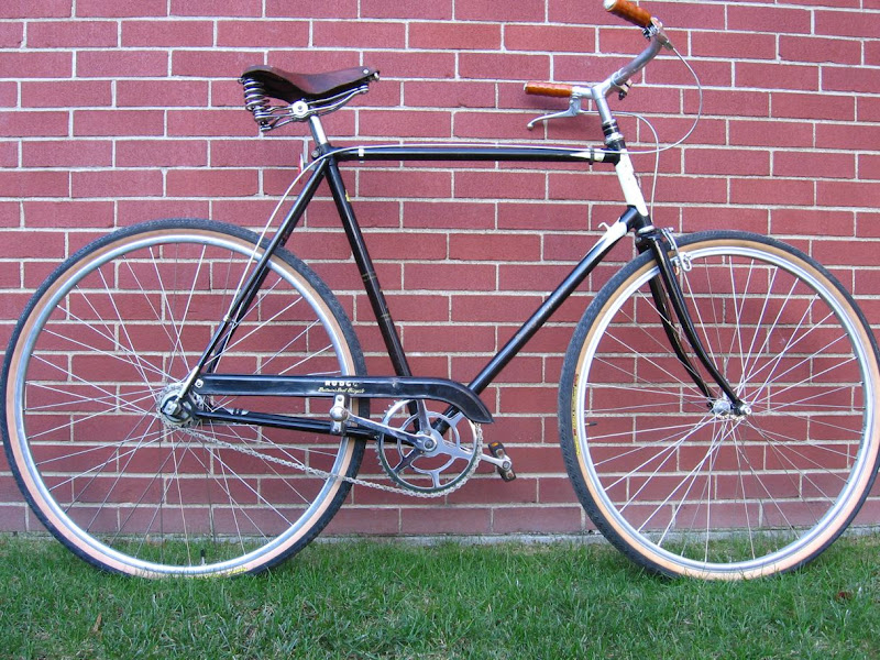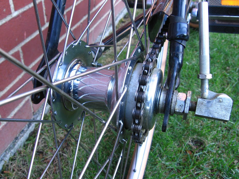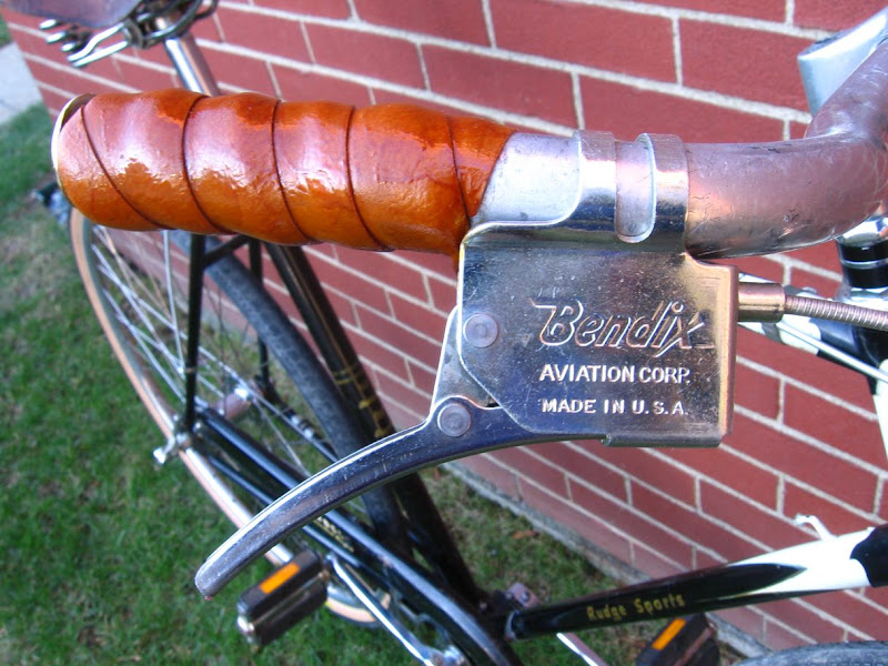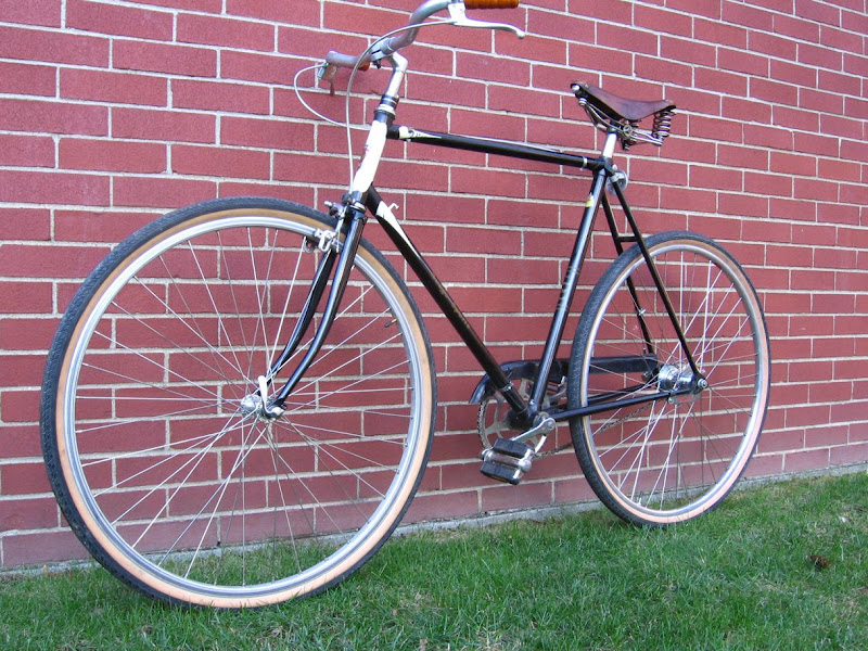 Here's a recently completed project: a 1970s Rudge Sports frameset w/ a rear Bendix 2-speed cable-actuated hub built into a 700c Rigida rim. I put on a cheapo hi-ten fork to handle the 700c front wheel, 35mm Pasela tires, a Brooks B66 with a hole in the middle (but it still rides fine), a front Weinmann brake, and some Luxe upright bars. Total weight is about 29.5 lbs. The ride is a hoot. The massive trigger really pops the thing into high gear, and the wide tires give it a bomber effect. With smaller tires, I could get some fenders on there, but it'll do for now.