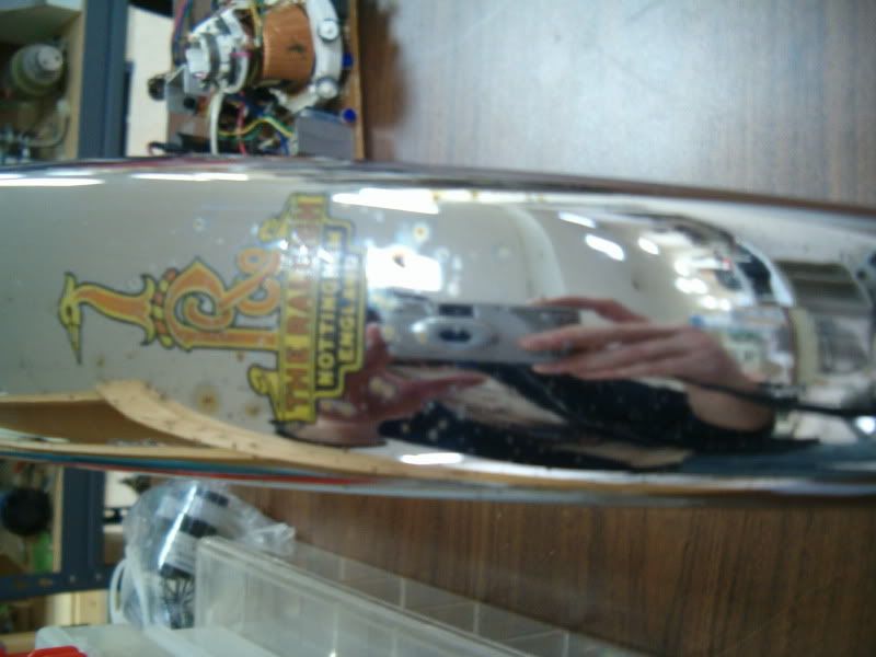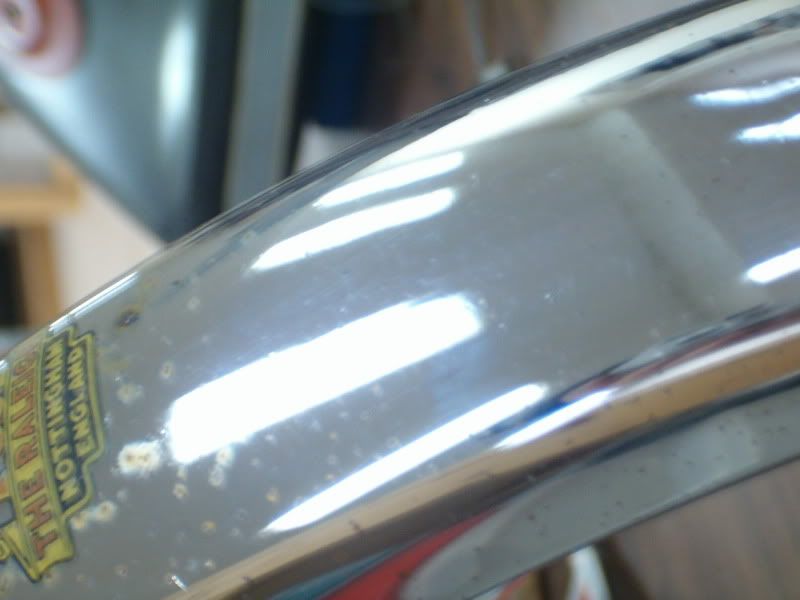 Here's an attempt to show you the little black dots that I called the "epicenter" of each rust puddle. They are hard to photgraph and literally look like little black specks. The bottom right corner of the picture, on the lip of the fender, has the best shot of them. The rust around the graphic is un-touched. I used mothers on everything to the right of the graphic though and it took the rust down to those specks.
