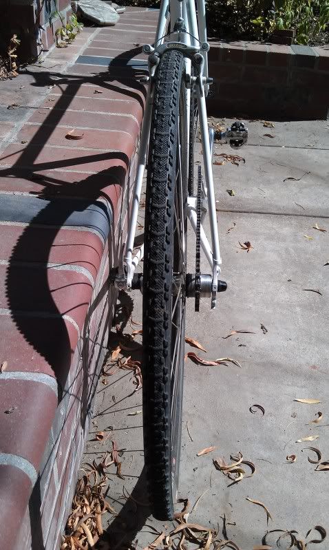The brakes are Raleigh branded Mafac knockoff centerpulls. I bought them on eBay a few years ago for a song but never had a bike to put them on. The tires are Kenda Kwick knobbies. They're labeled as 30mm but they look a bit narrower than that to me.