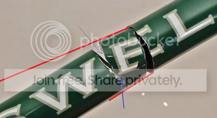 A bicycle downtube should be in tension (reference wire bikes). If the tube sheared/unraveled as we're lead to believe while riding, it would have been under its typical peak load (weight of rider (live load), weight of bike (dead load), and other small live loads. Assuming all other tubes were in their proper places and the addition of other tubes never took place, the break as pictured makes little sense to me. Assuming forces pulling to the upper right and lower left of the picture as we see it, the break should occur as pictured. However, this tube is supposedly part of a frame. This then should change the direction of tensile forces, pulling them more in the vertical direction (as in, if the downtube failed, the bike could potentially fold in half.). The break then, should bow outward to the bottom right of the picture. Placing a straight edge on the picture shows it does not bow in that direction. In fact, it bows in the opposite direction, which I'll attribute to the lens of the camera. The break as pictured appears to have been generated by forces exactly parallel to the tube. Forces that I don't believe exist on that tube in a bicycle.