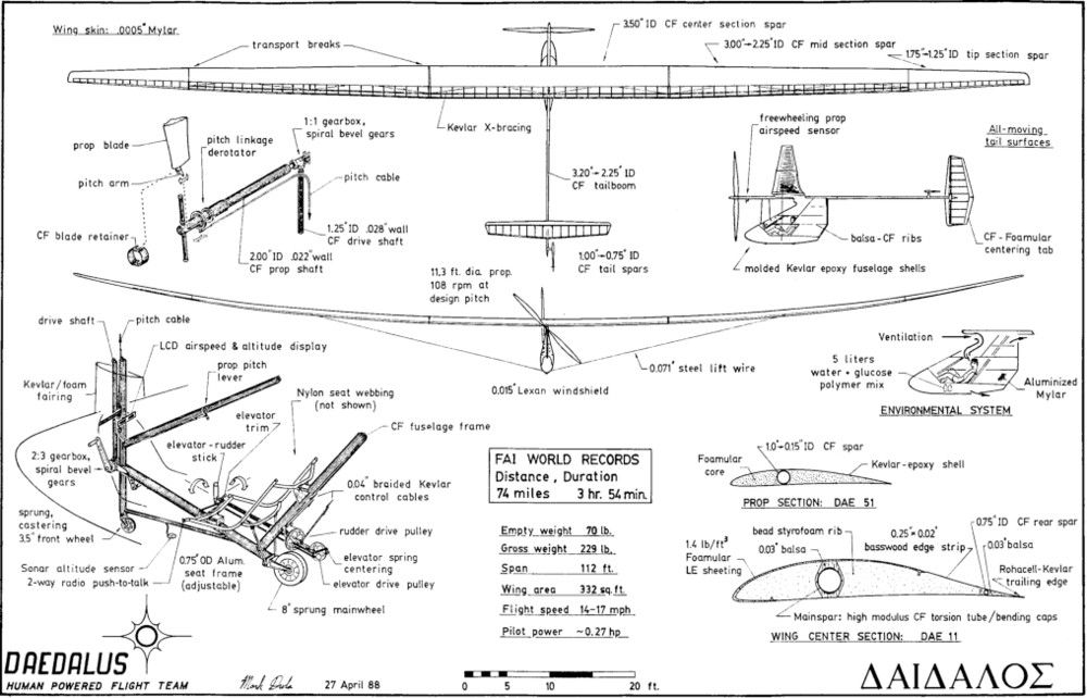 Here's a three-view of 'Daedalus', MIT's FAI record setting (74 miles in 3 hours, 54 minutes) HPA. Wingspan is 112 feet, and empty weight is only 70 pounds. Remarkable.