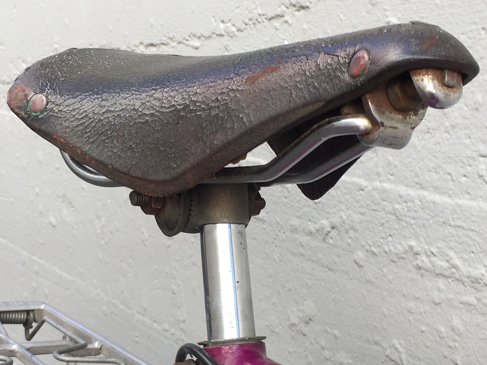 I’m not so sure it’s a Brooks. A Brooks should have some form of tag in the rear correct? And possibly hangers for a bag. Someone observed that this saddle may have been trimmed at an angle to replicate a higher end saddle. Here it is though in case anyone can determine what make/model it might be.