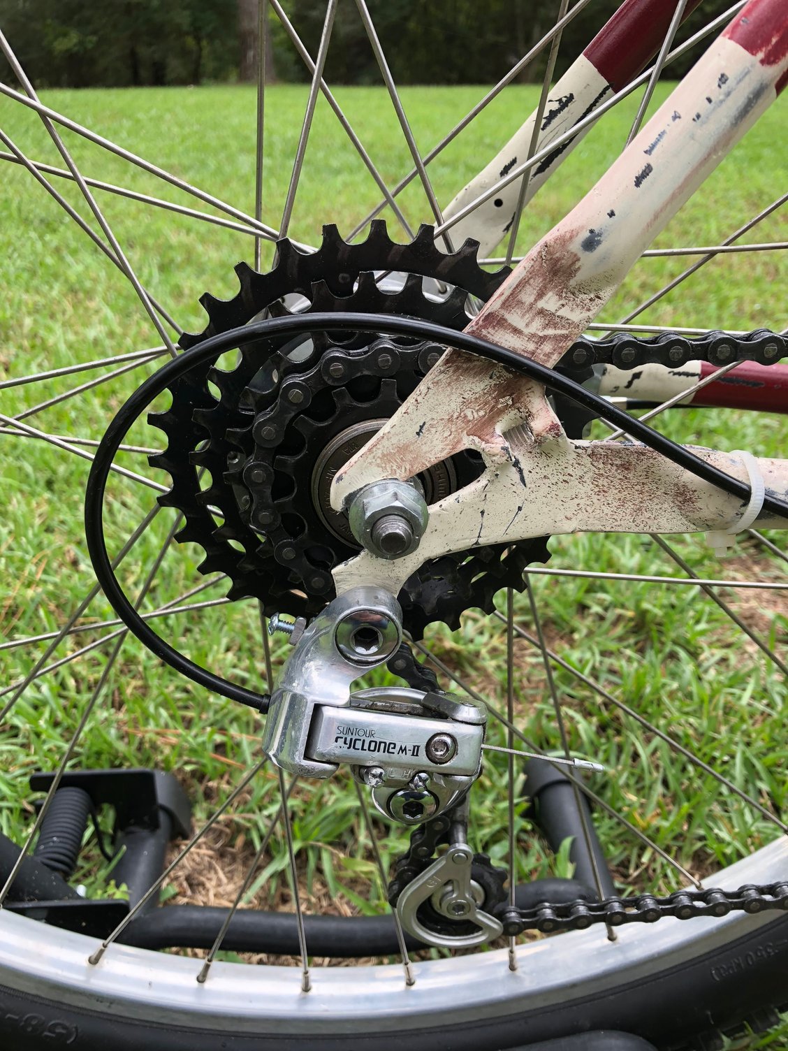 I have been hankering for a Klunker for a few years. So I picked up an old Schwinn DX with a "The World" head badge. The bike was in decent shape for being over 70 years old. It had mostly original or at least period parts and a flat black rattle can paint job and good riding but dry leather saddle. It is structurally sound except for the stay bridges being mangled. I welded a derailleur hanger on the rear dropout because I'm old and I want gears. Sourced a Sachs drum brake hub on a Sun rim, a chrome fork with canti bosses and pedals from eBay. New grips, cable stop, bottom bracket adaptor and headset from Amazon. The rest of the build came out of the parts bin with mostly mid 1980's parts including a Suntour Cyclone M II rear mech and a Biopace crankset. 5 speed 14-32 freewheel shifted with Shimano EM thumbies. Gotta do something about all of the wire ties though. I gave it a faux "survivor" paint job including cream colored "socks" on the rear. It is very fun to ride and surprising nimble coming in right at 33 lbs. All the original parts were saved so she can go back to where she started by grinding the derailleur hanger back off. Sorry for no before pics. Last pic is from the shakedown cruise. 8 miles of hilly trails. Made me thankful for that 32 on the back.