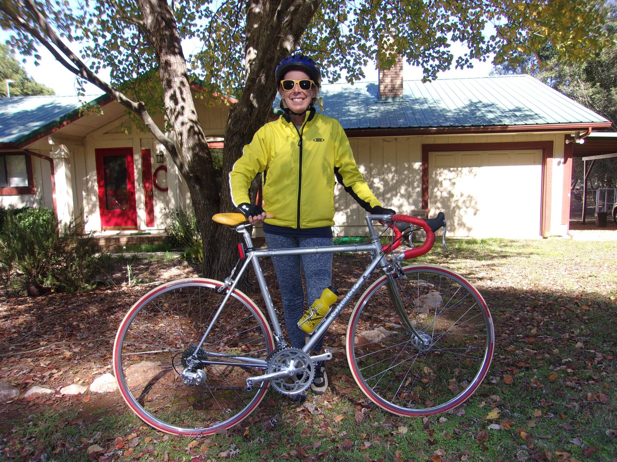 My wife with her San Cristobal. The downtube-headtube lug on her 1985 Brianchi Brava broke clean through so I moved the parts to a beautifully restored frameset from Italy that I bought on Ebay. It is actually signed by Giovanni Pelizzoli.