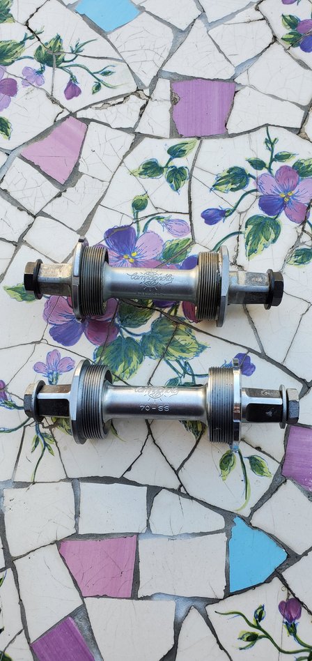Campagnolo Record Italian and English bottom bracket complete with bearings, crank bolts and lock rings. Cones are in great condition. Rifled version on both bottom bracket cups.
