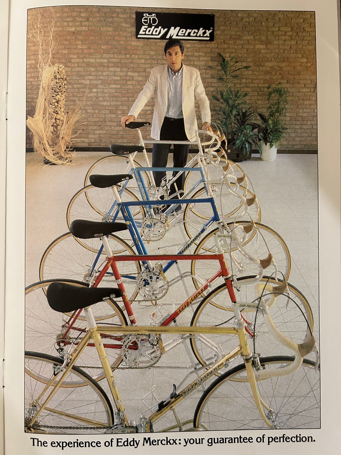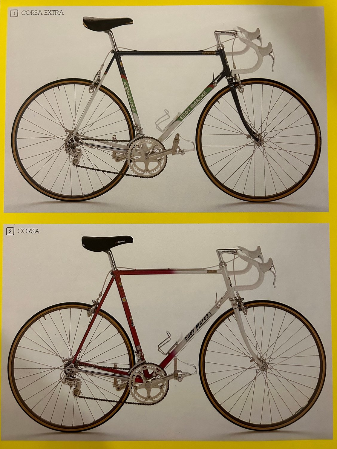 The two photos are from 1980s Merckx catalogues, the first from the early 1980s (production started around 1980) and which shows the EM80 decal style. This was the only style in common usage before 1986 and would be period correct for the repainted blue frame. The second photo is from around 1987, and shows the EM86 decal style introduced in 1986. Interestingly the Corsa Extra and Criterium frame at that time had EM86 decals while the Corsa and Strada had EM80. Possibly to differentiate the less expensive models or to use up old decal stock.