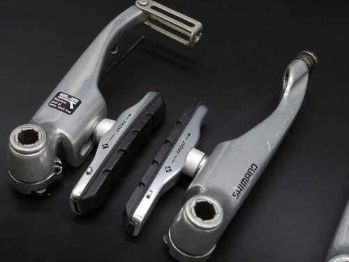 The front brake looks like late 90's Shimano LX V brake (BR-M600) with its screen printing polished off.