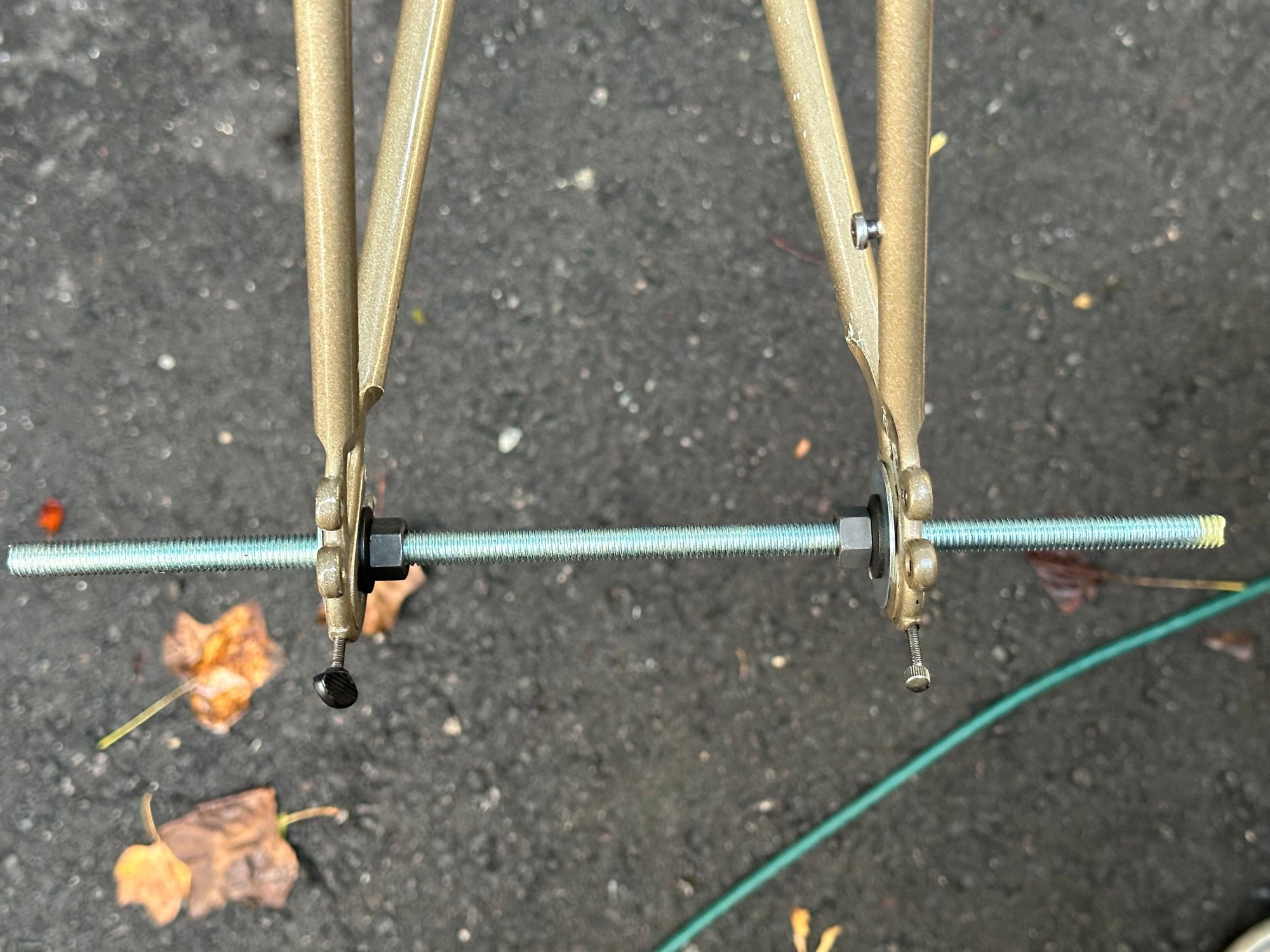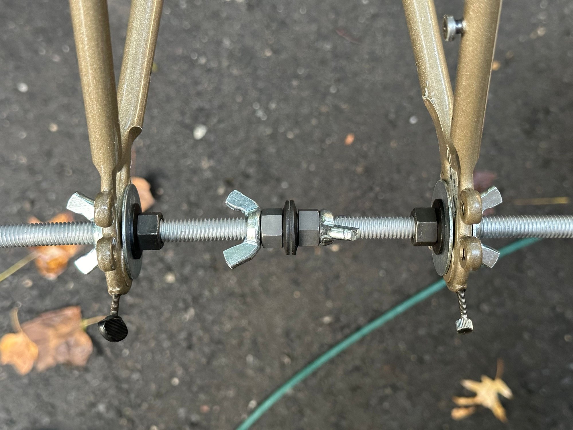 The space between was only 123mm so I re-fashioned the parts into a spreader and tried to get it to 126. After a few lesser attempts, I finally quit after spreading the stays to 160mm+, but they sprung right back.