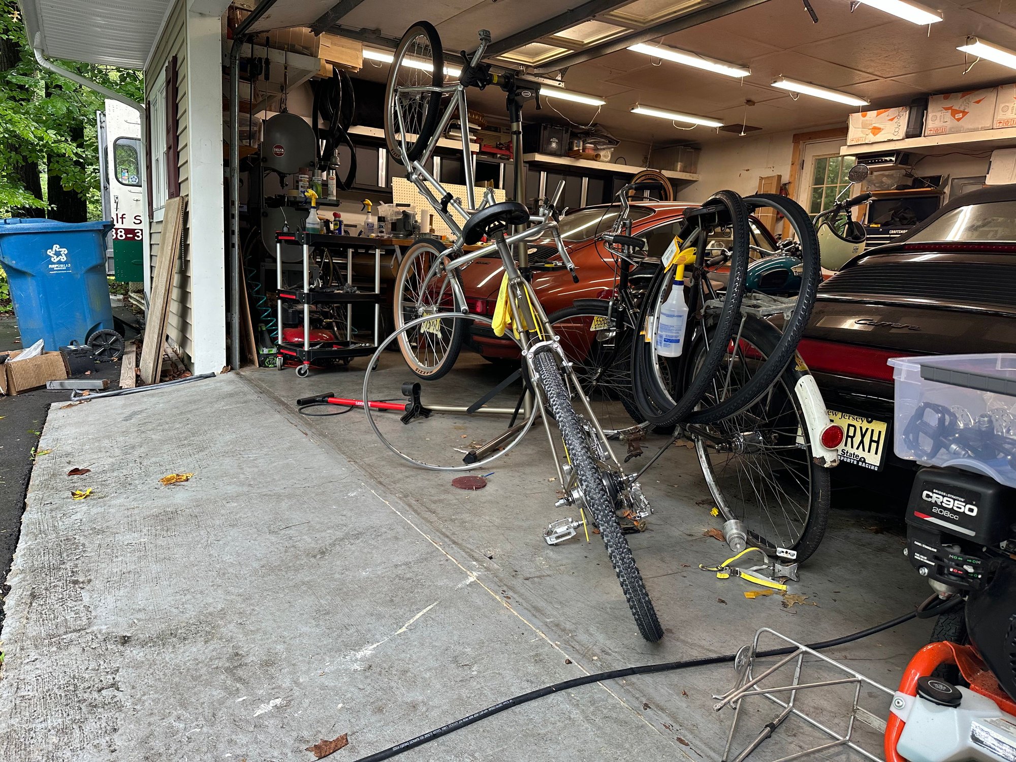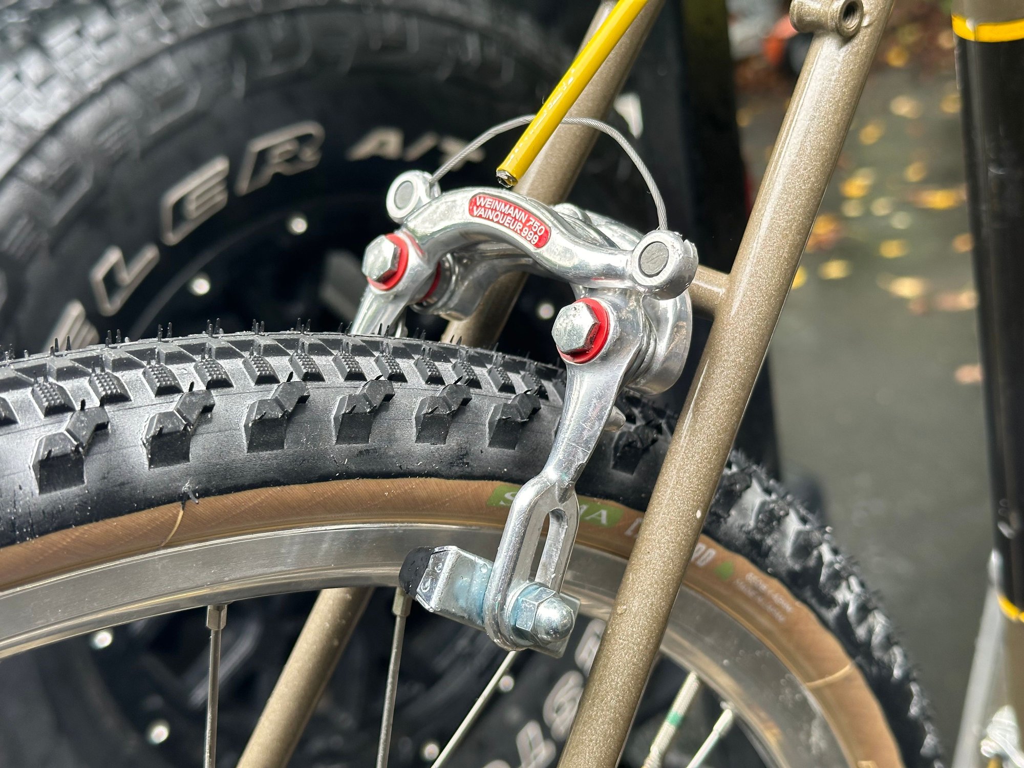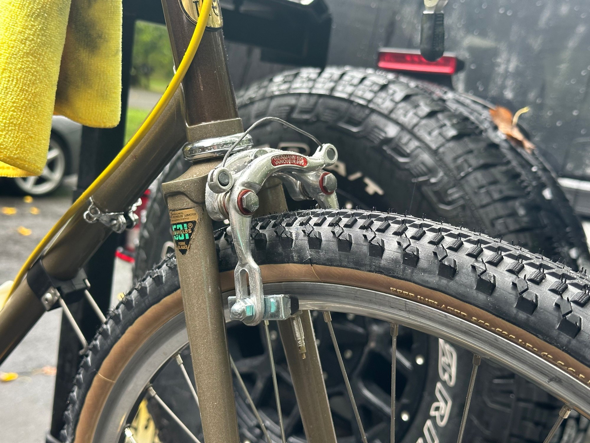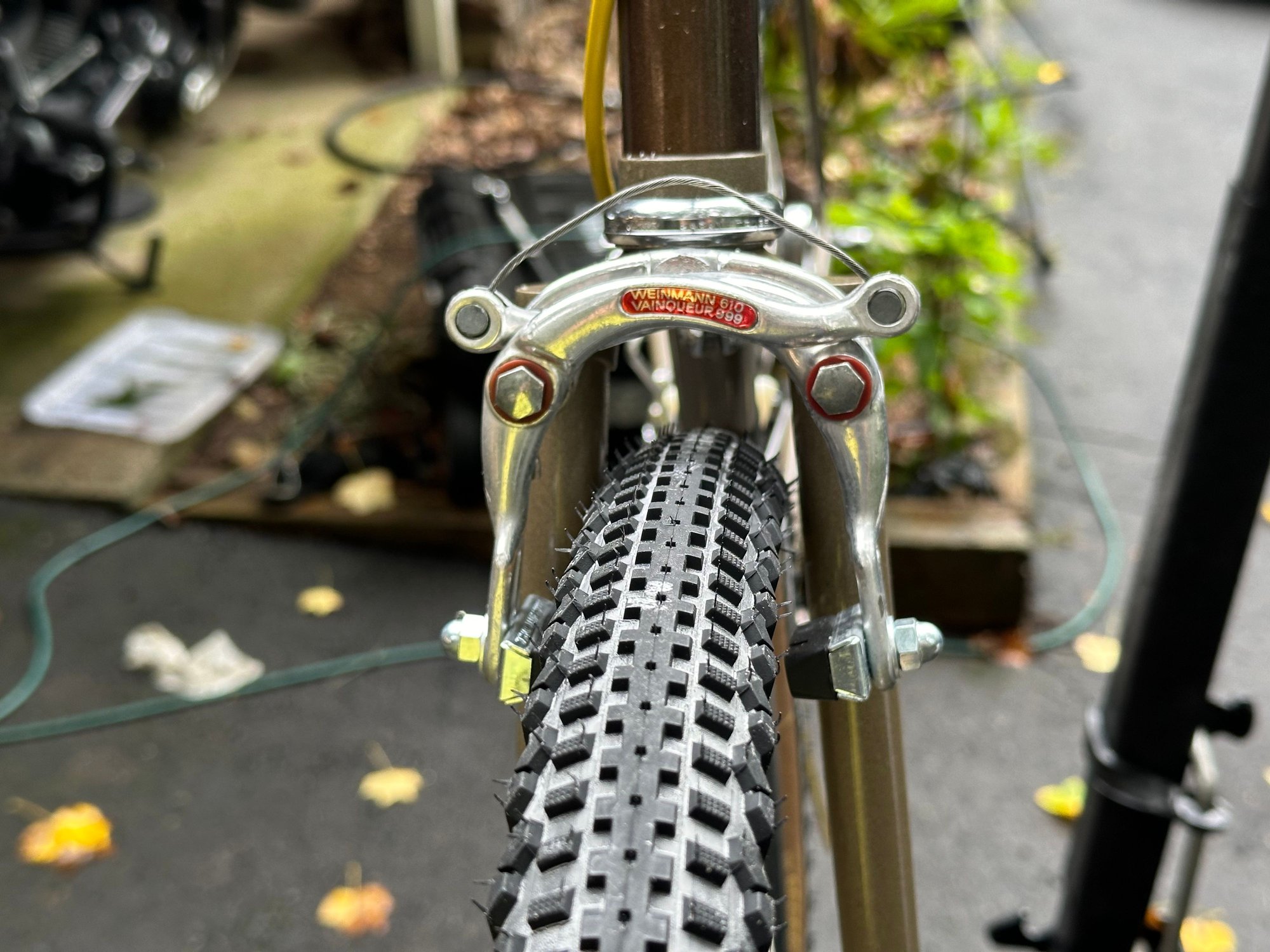 So the 42mm tires came in. I couldn't resist mounting them to the old-hubbed rims just to finally get a real picture of BB clearance. I'm getting 10.5", or 267mm with 170mm cranks. Good enough for a 30% gravel bike?