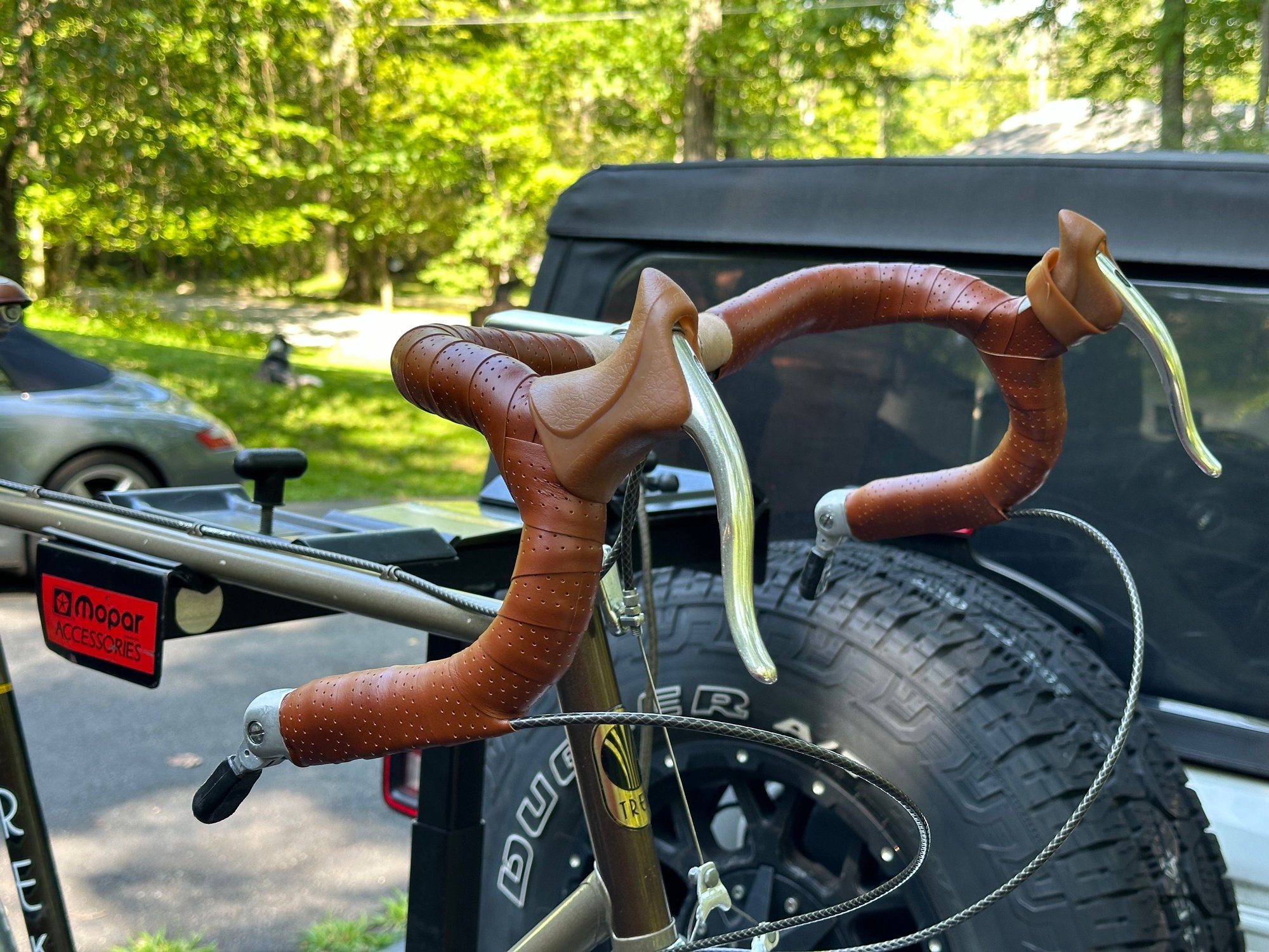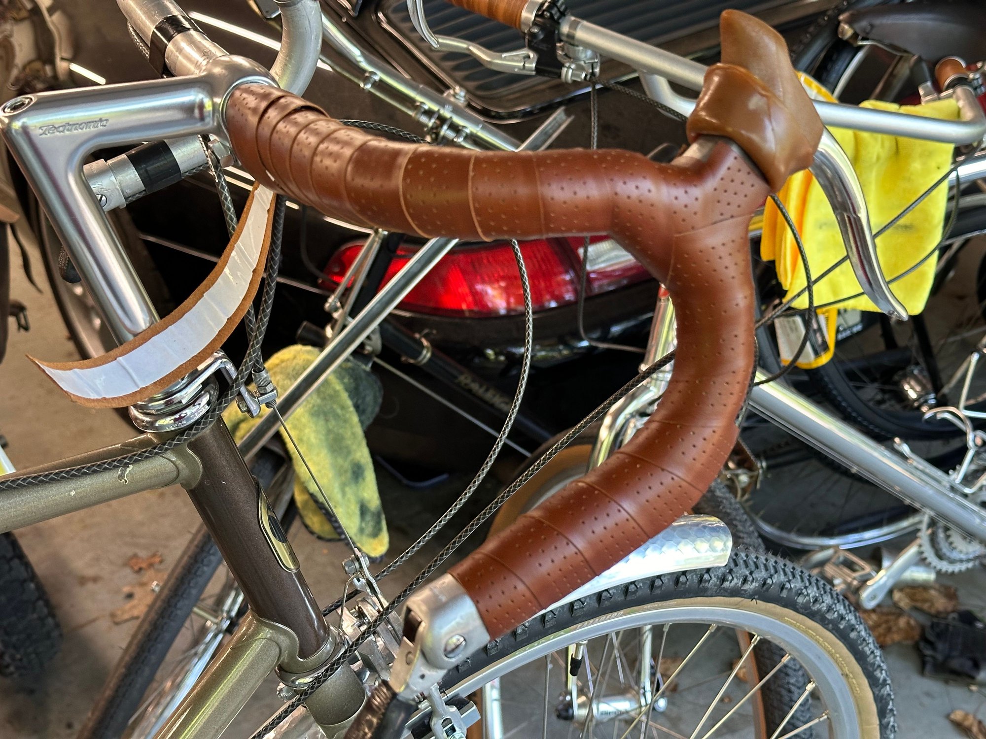 Tackled the bar tape job this morning. I wanted more padding than just the Brooks leather wrap, but I didn't want to put a whole under wrap of regular tape. I'm not fond of that baseball bat thick handlebar look (or feel).