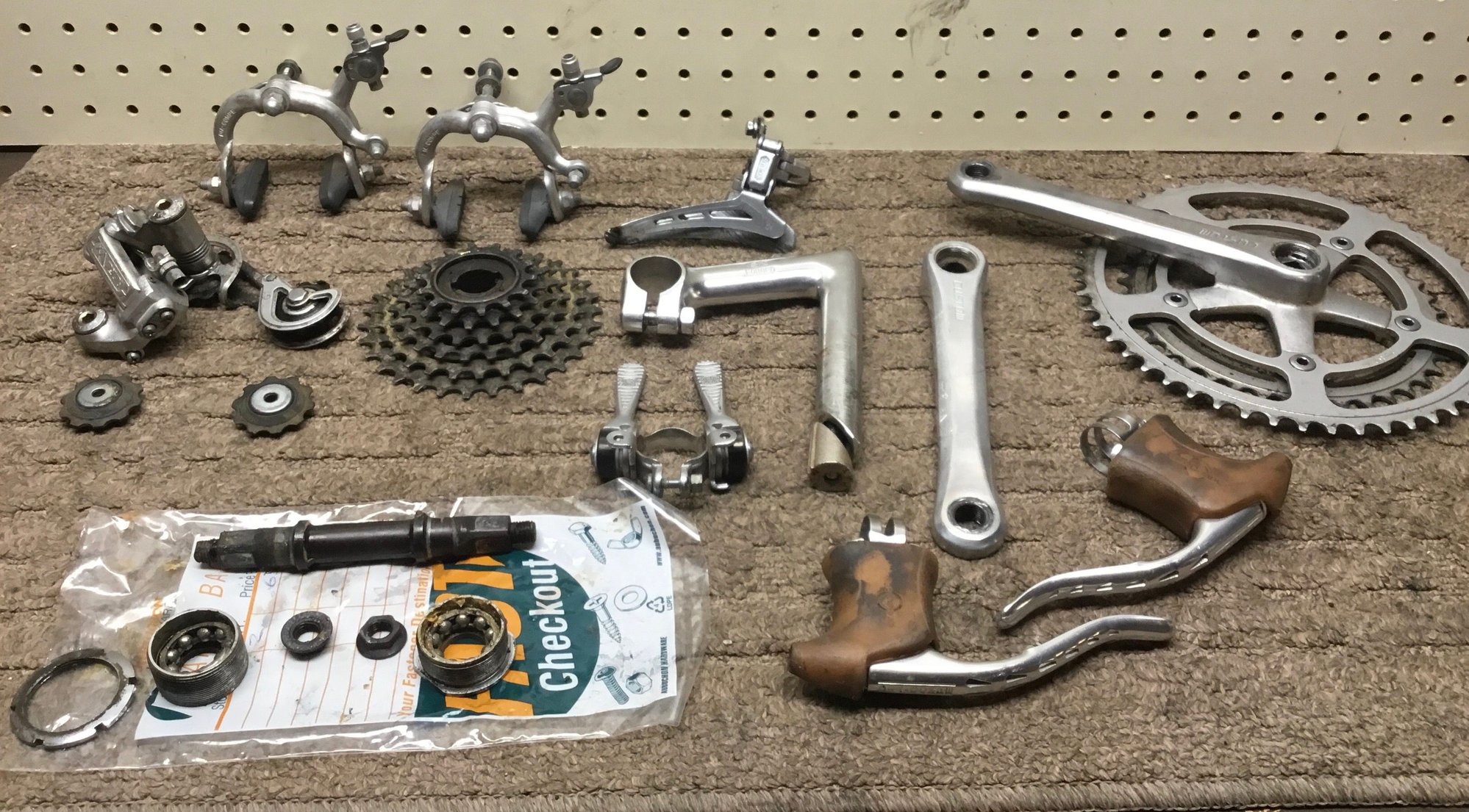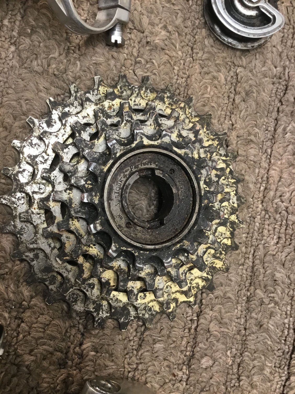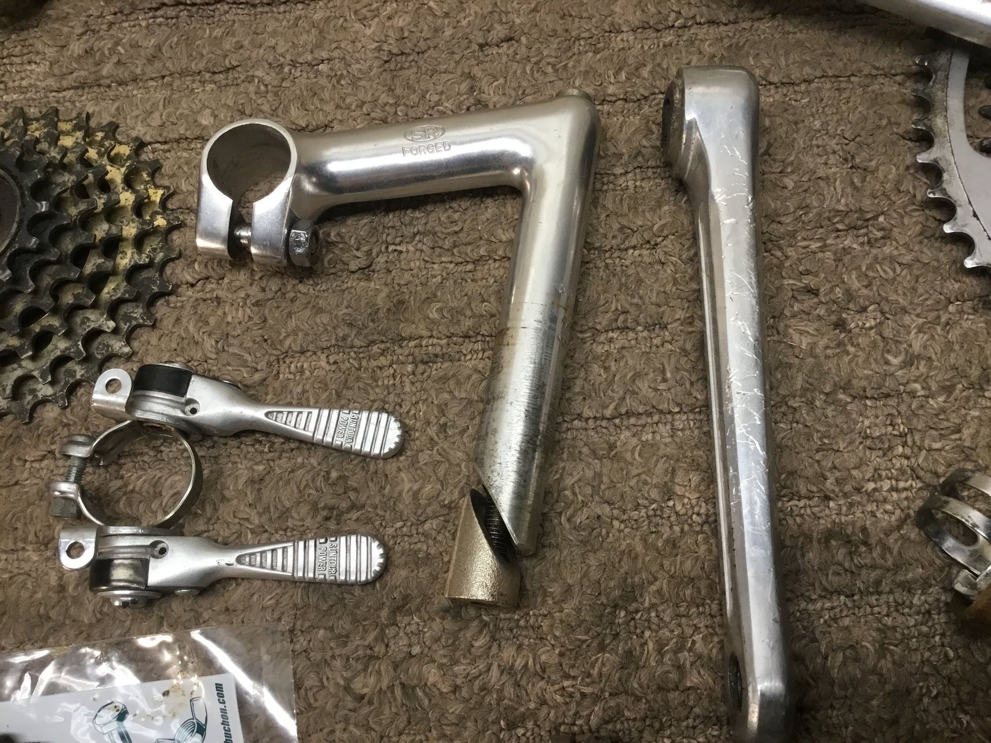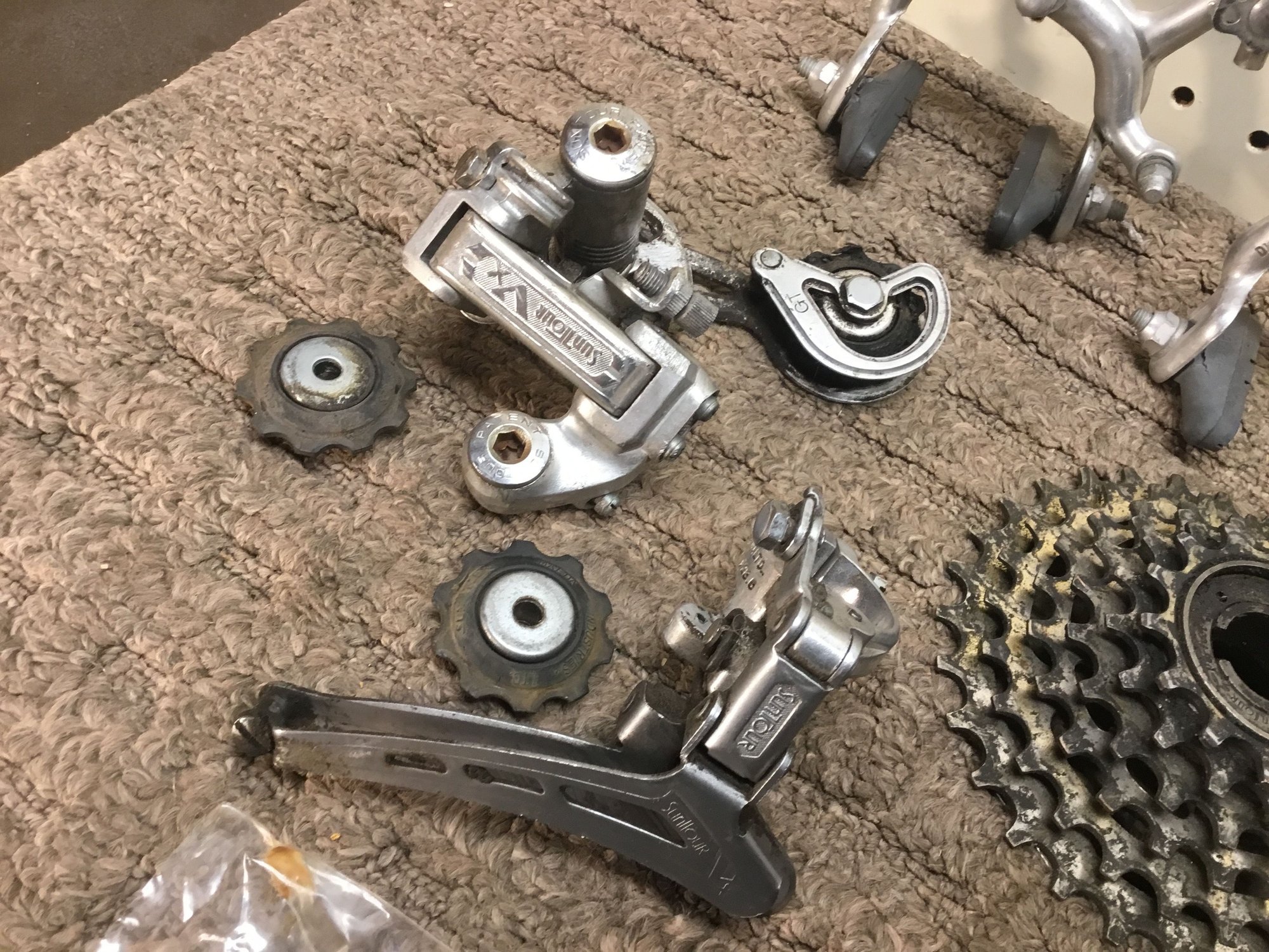 Early Eighties Trek build kit in good condition but most parts need of a good cleaning and or a total overhaul. SunTour VX Deraileurs with a very nice (but dirty) pair of replacement pulleys, SunTour power ratchet levers, Dia Compe Single pivot calipers, brake levers, SR 100mm stem, SunTour 14-30 perfect 6 speed Freewheel (stack height 29mm) Eng threads, SR Custom 52/40 170mm crank, 3P Spindle Eng BB (equivalent to 122.5 symmetrical spindle).I can also include a chain and other parts you may need just ask. BB cups and cones free of pitting. Brake Level hoods have some scrapes but are largely intact. NDS crank arm has some good starches on one side. While not perfect these parts should clean up nicely, nothing is missing any pieces.
