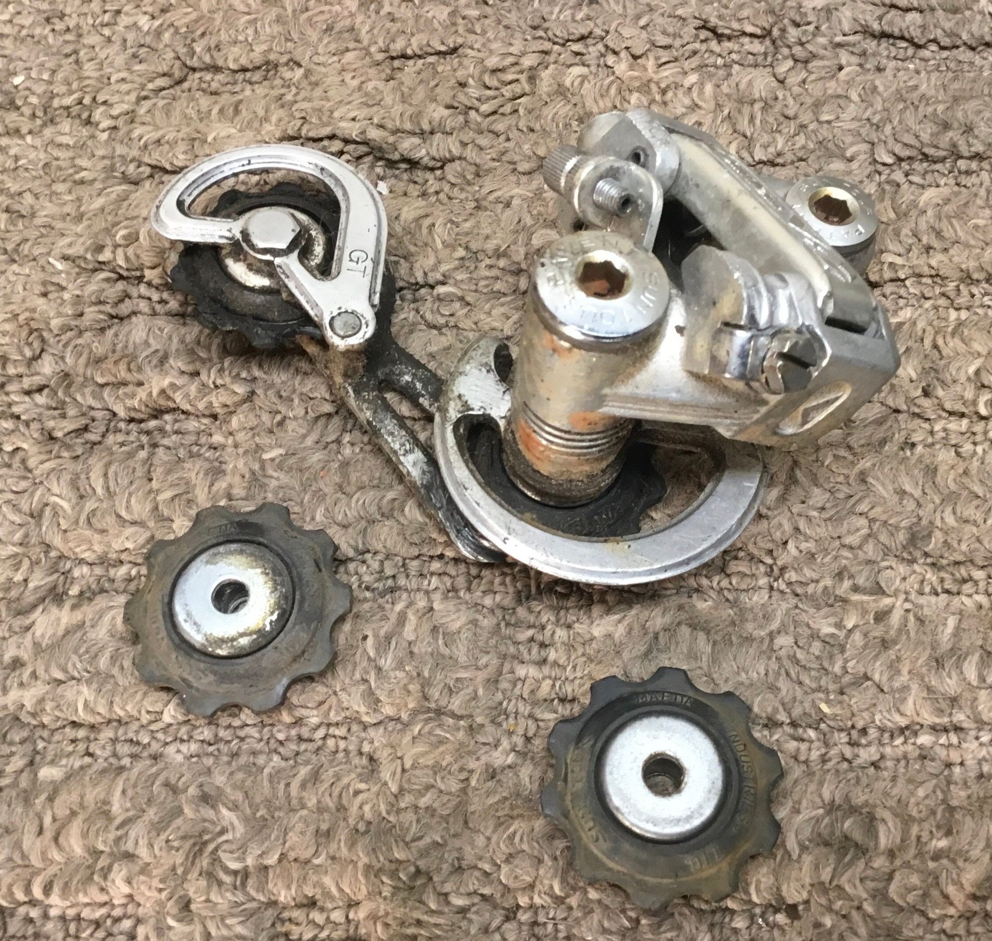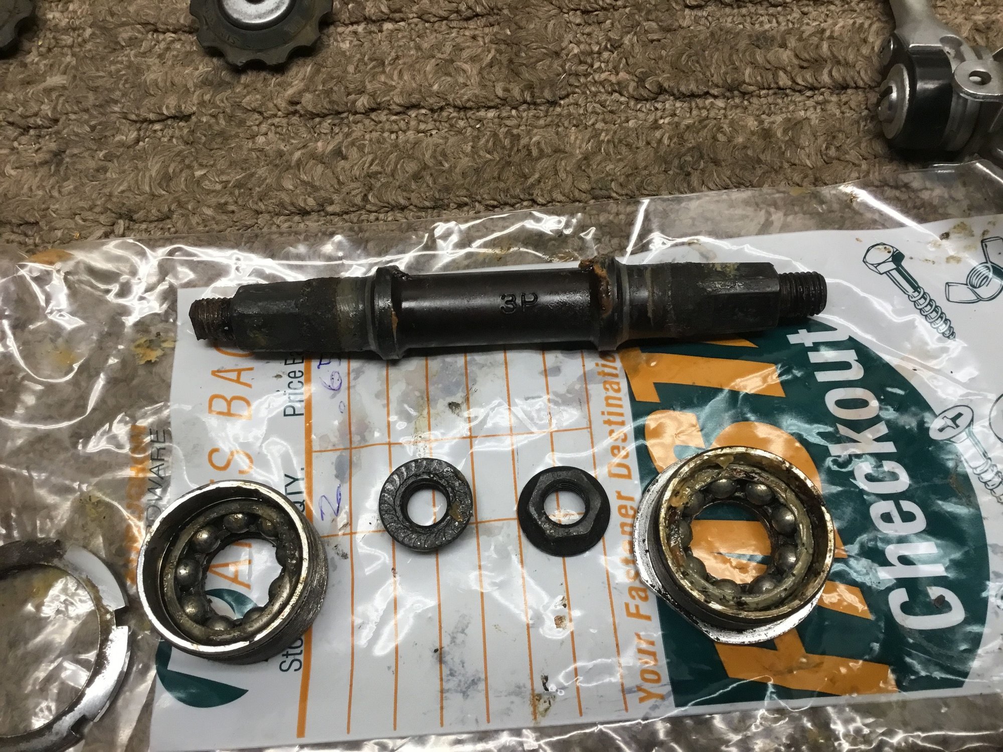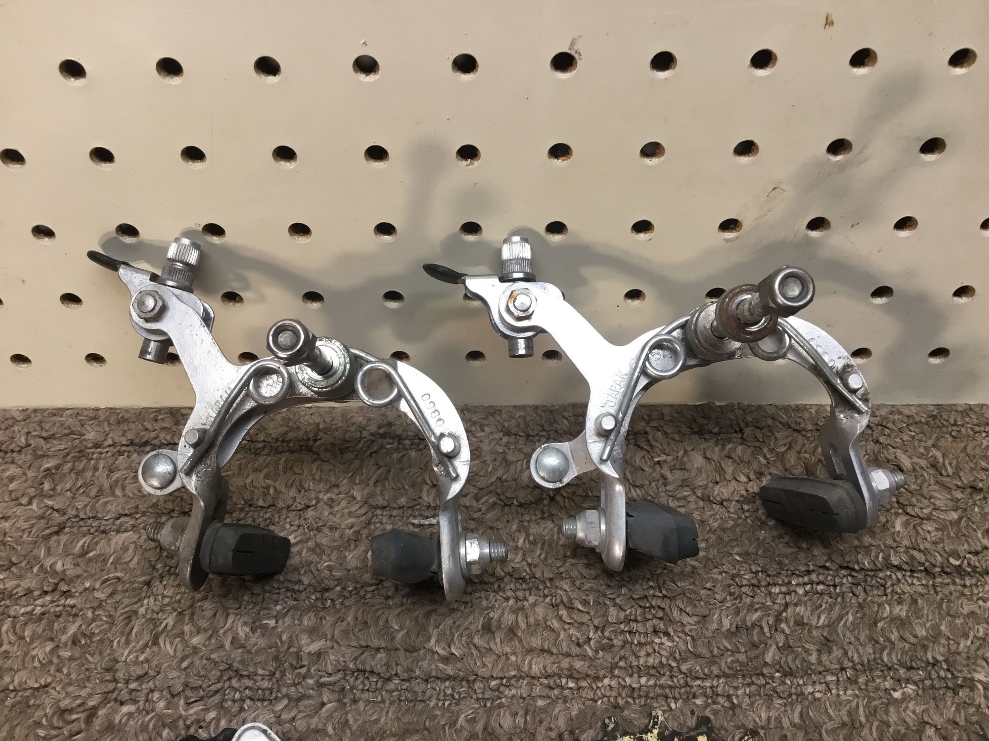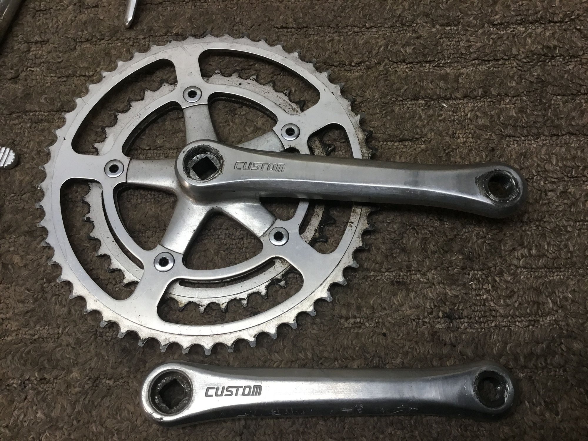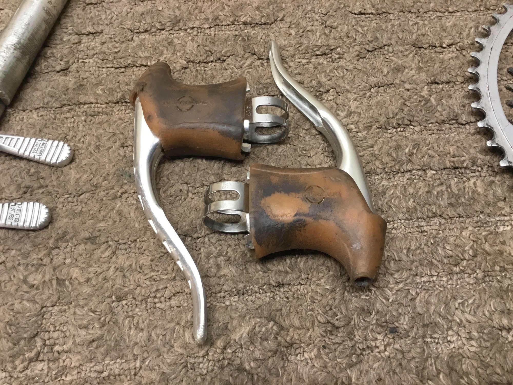 Early Eighties Trek build kit in good condition but most parts need of a good cleaning and or a total overhaul. SunTour VX Deraileurs with a very nice (but dirty) pair of replacement pulleys, SunTour power ratchet levers, Dia Compe Single pivot calipers, brake levers, SR 100mm stem, SunTour 14-30 perfect 6 speed Freewheel (stack height 29mm) Eng threads, SR Custom 52/40 170mm crank, 3P Spindle Eng BB (equivalent to 122.5 symmetrical spindle).I can also include a chain and other parts you may need just ask. BB cups and cones free of pitting. Brake Level hoods have some scrapes but are largely intact. NDS crank arm has some good starches on one side. While not perfect these parts should clean up nicely, nothing is missing any pieces.