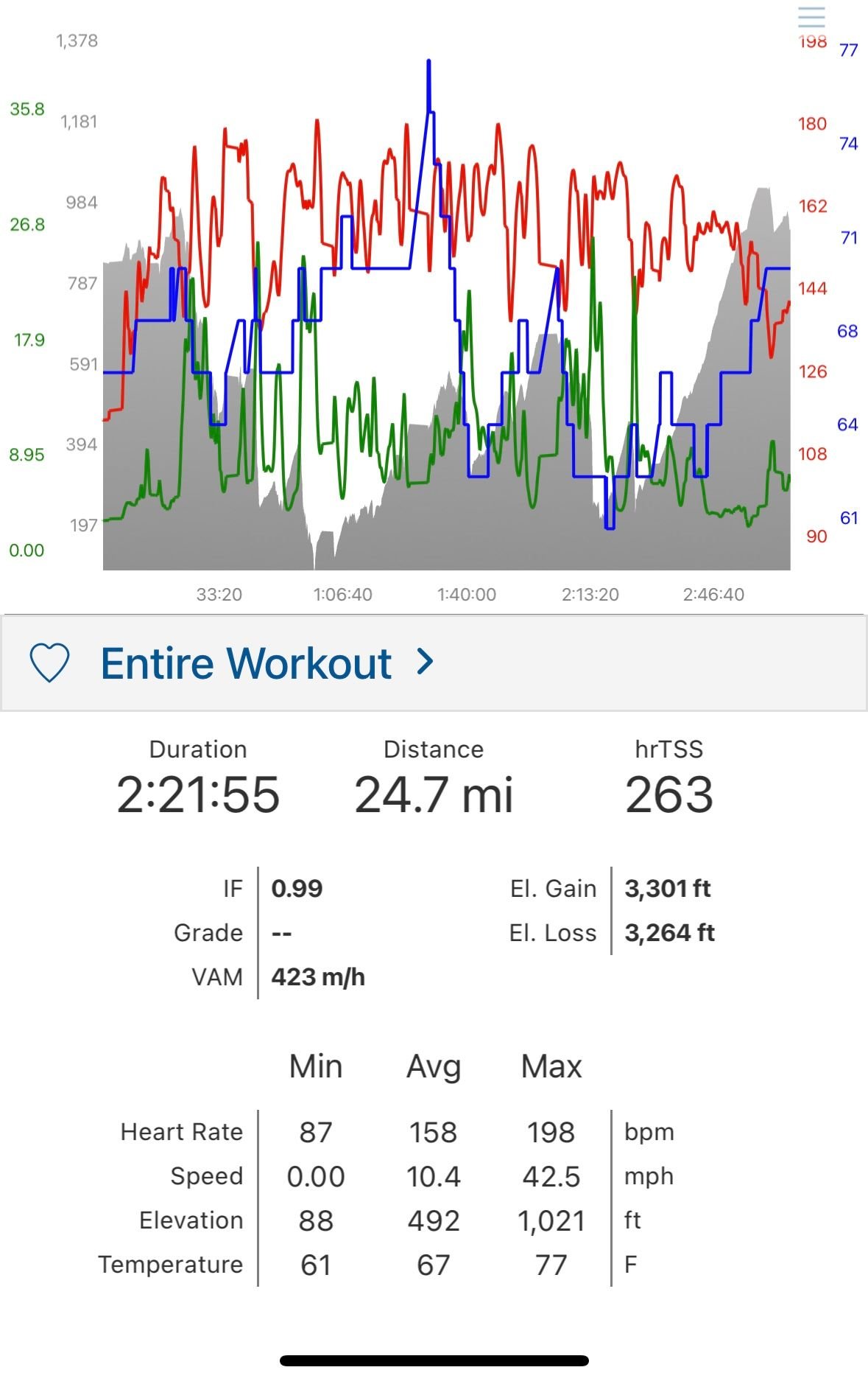 The one thing you get here is lots of climbing. 3300 ft in 25 miles. I still think I may switch out to a 40 tooth front from a 44.