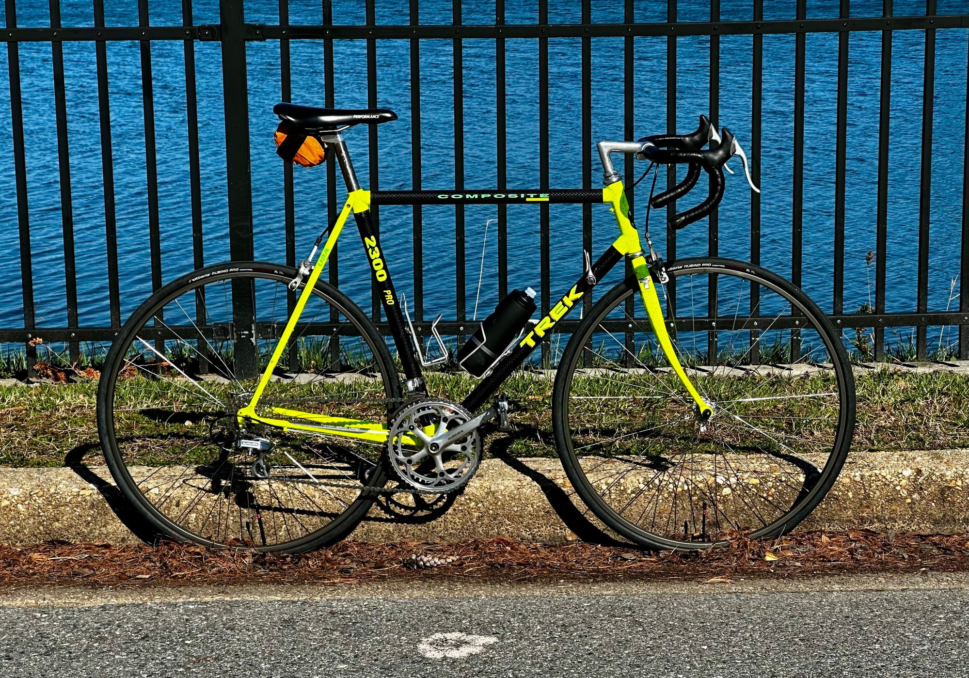That is one of the most sanitary neon Treks I've seen in years. The paint didn't like the sun. At all. I've seen more than one where you can tell which side of the bike faced out from the balcony. And the clear coat on the carbon tubes would get milky as well.