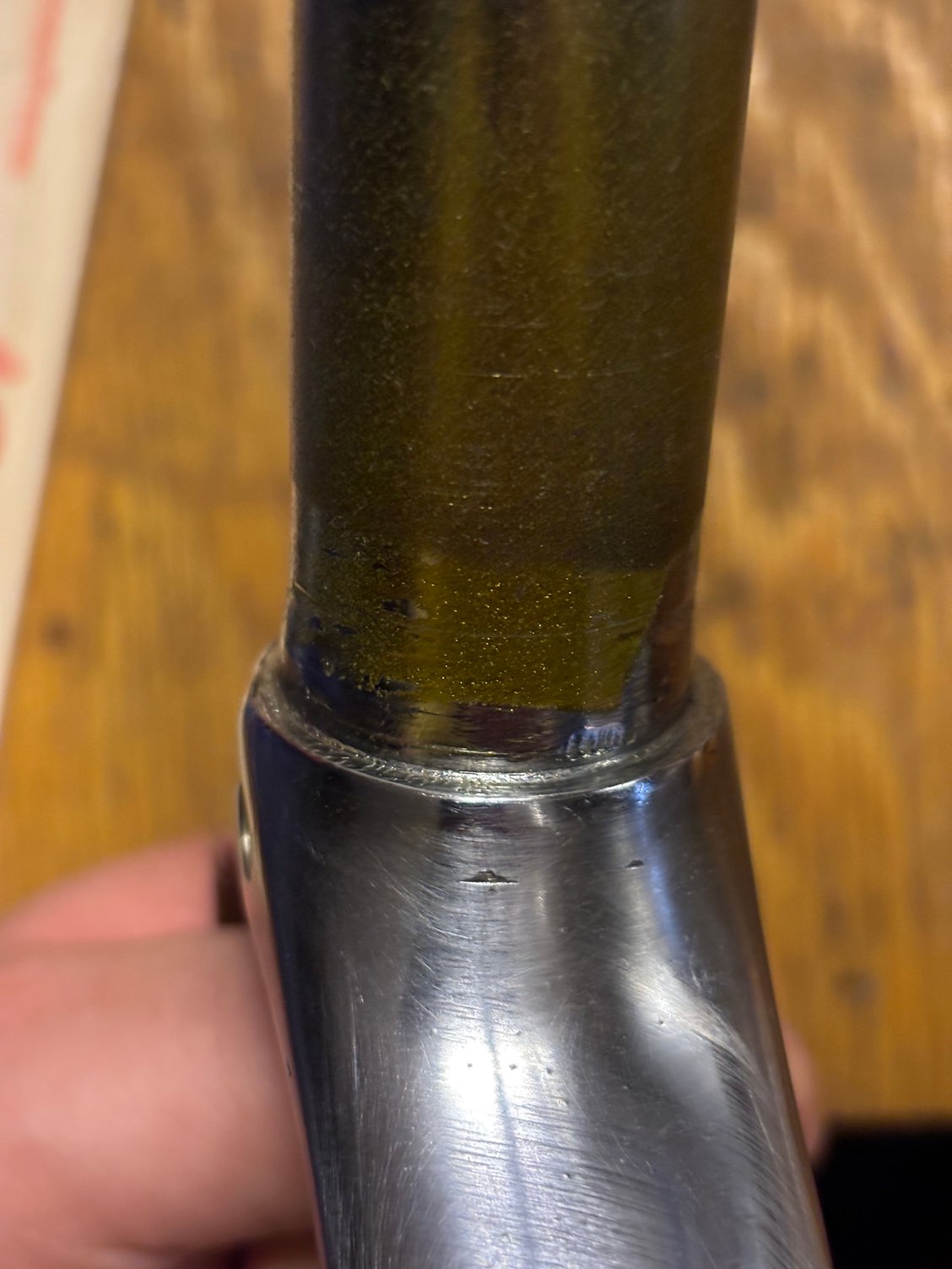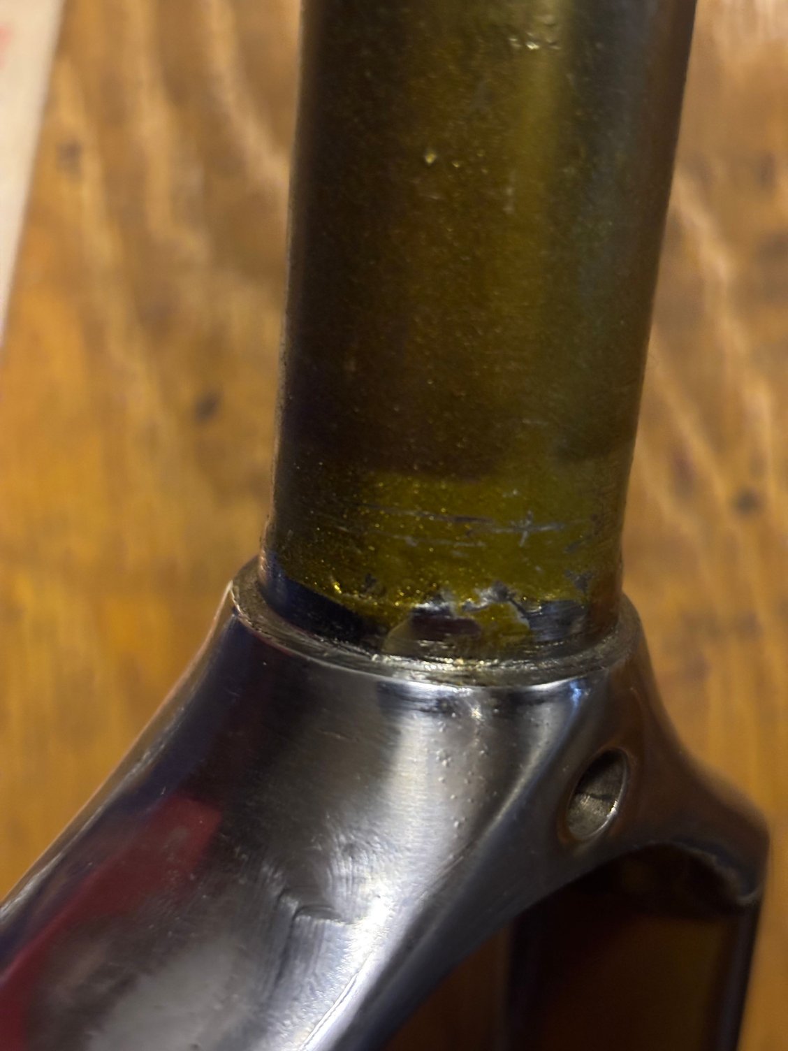 Here are some photos of the fork. No overspray issues, and the fork was not rechromed at any point after it was sold, so i believe this is how it arrived out of the factory. The previous headset fit fine, though i never took a close look!