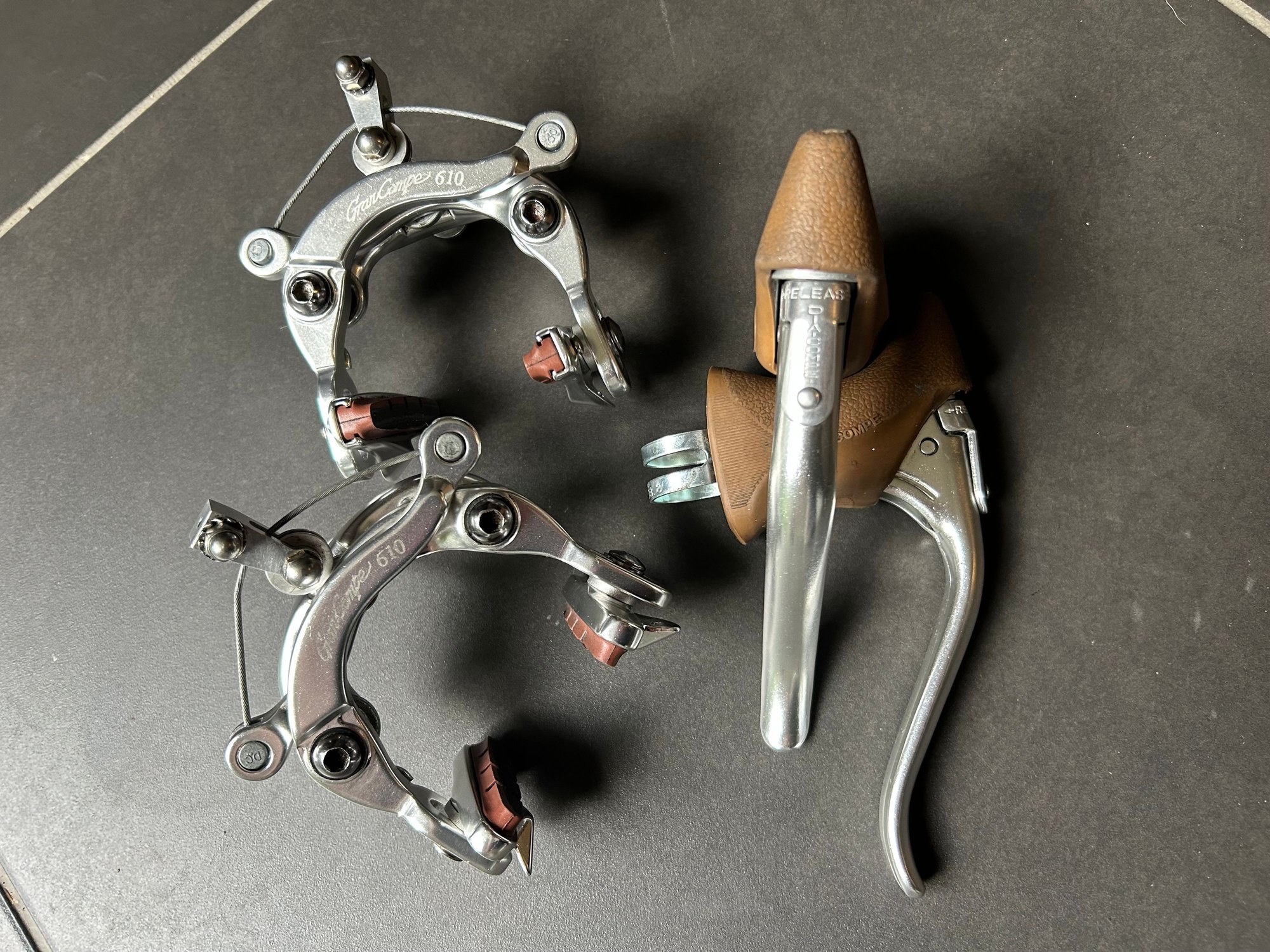 Gran Compe GC610 centre pull calipers and best matching DC202QC brake levers with integrated quick release. Also included is a pair of Rene Herse straddle cable yokes with titanium bolts, a needlessly extravagant USD45- value alone.
