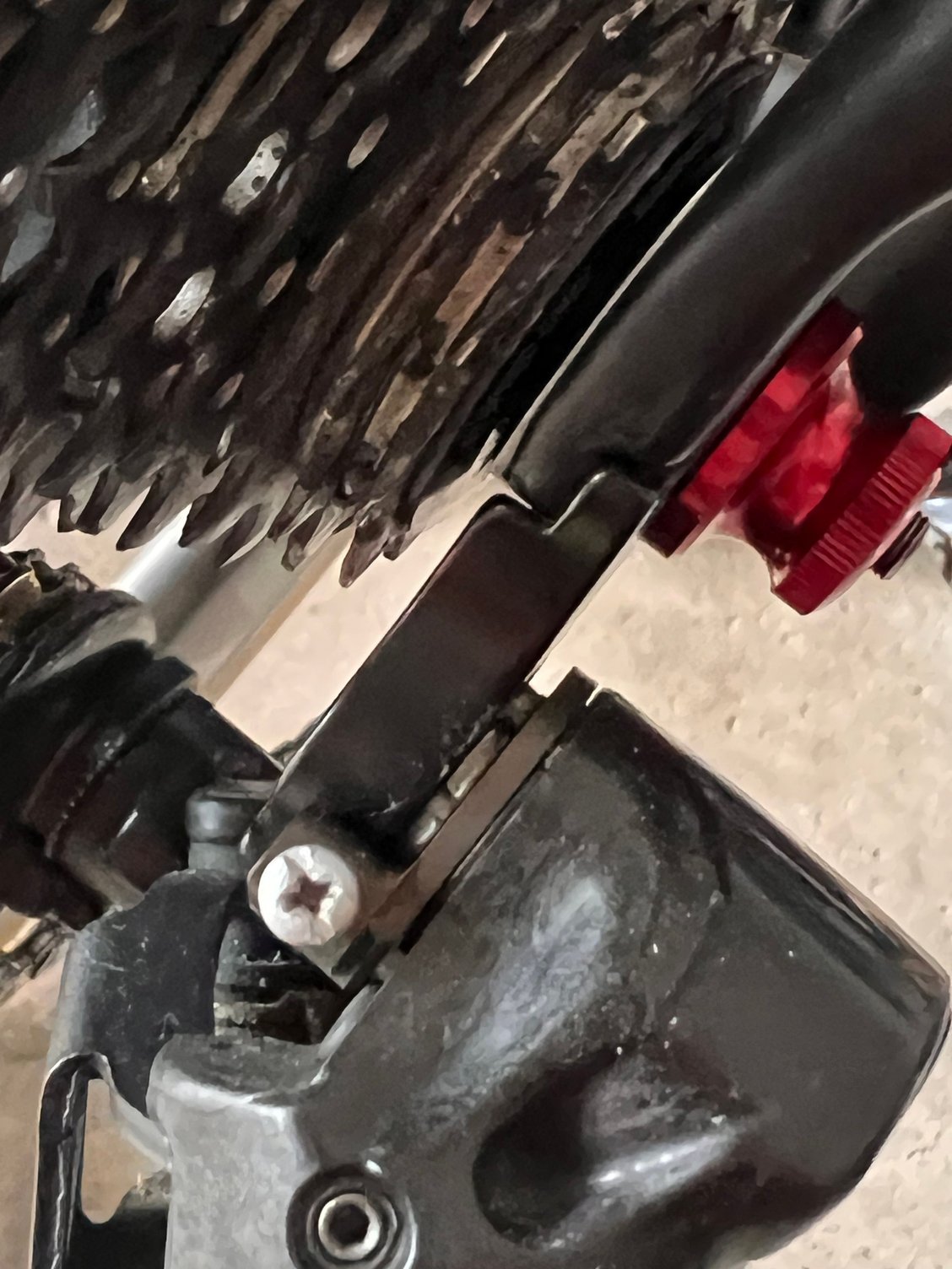 Failed lines of reasoning aside, I had my bike with the soft, “hand adjustable” derailleur hanger on the stand today to do a little tubeless maintenance since I haven’t ridden it in over a year. After adding some sealant, I took it on the road for a quick spin, only to find the derailleur out of alignment! I could easily see by the cage/cassette alignment what needed done, so I reached down, and with just my hand, pulled the derailleur until things lined up. Voila! Problem solved…again.