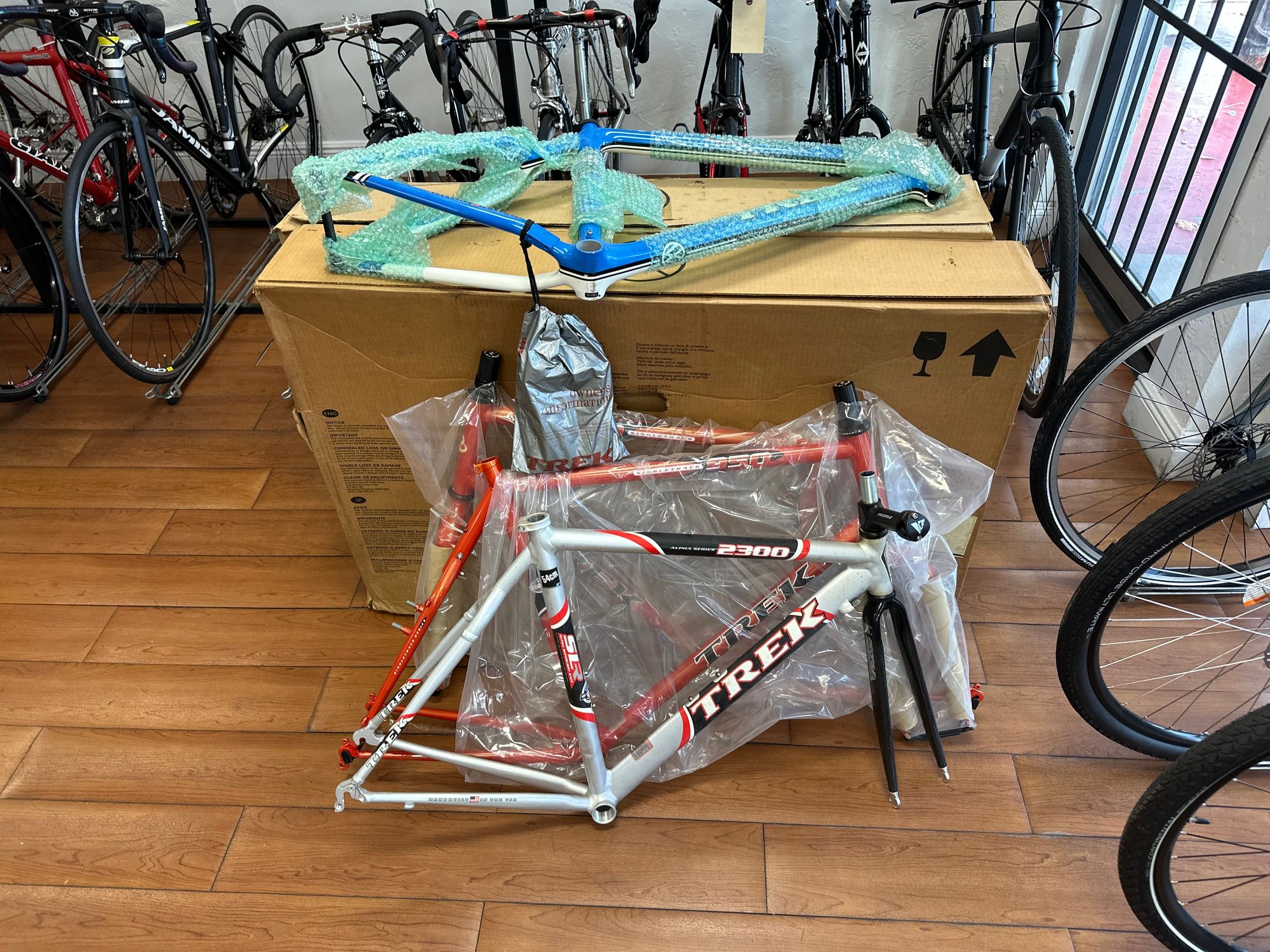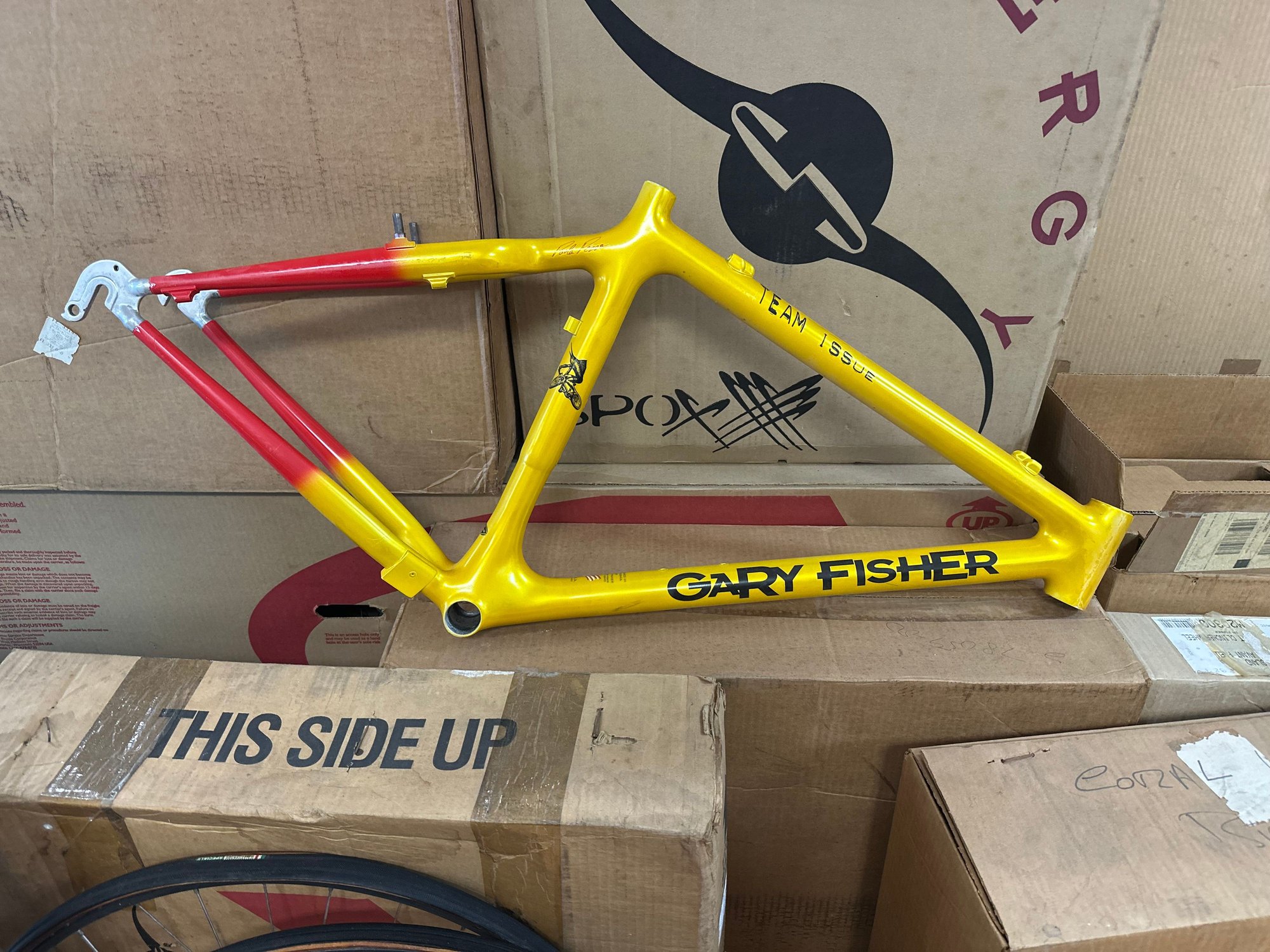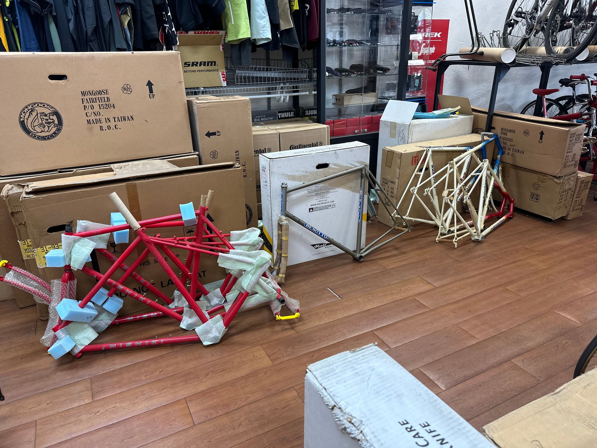 The Trek pile. I think there's another VW team replica frame in one or both of the boxes.