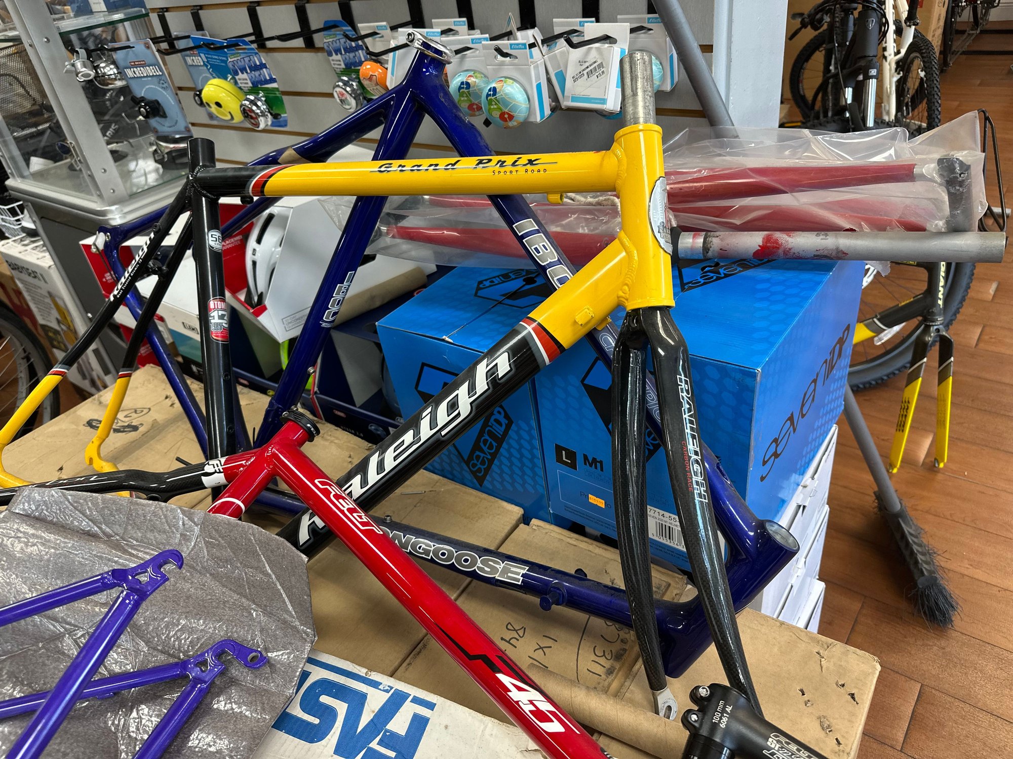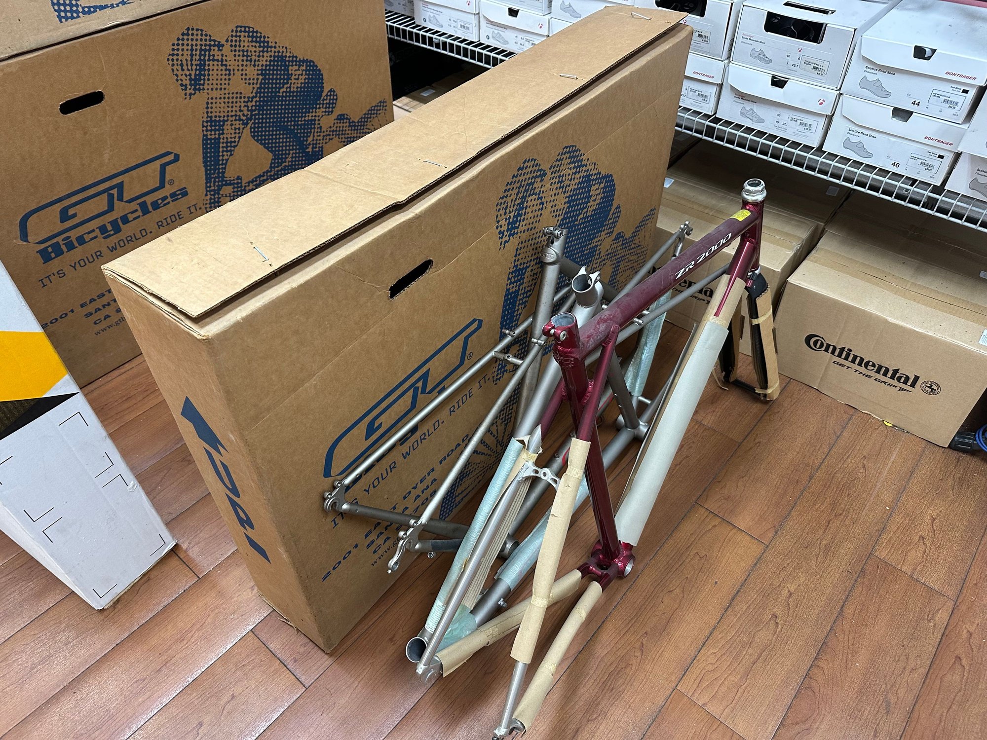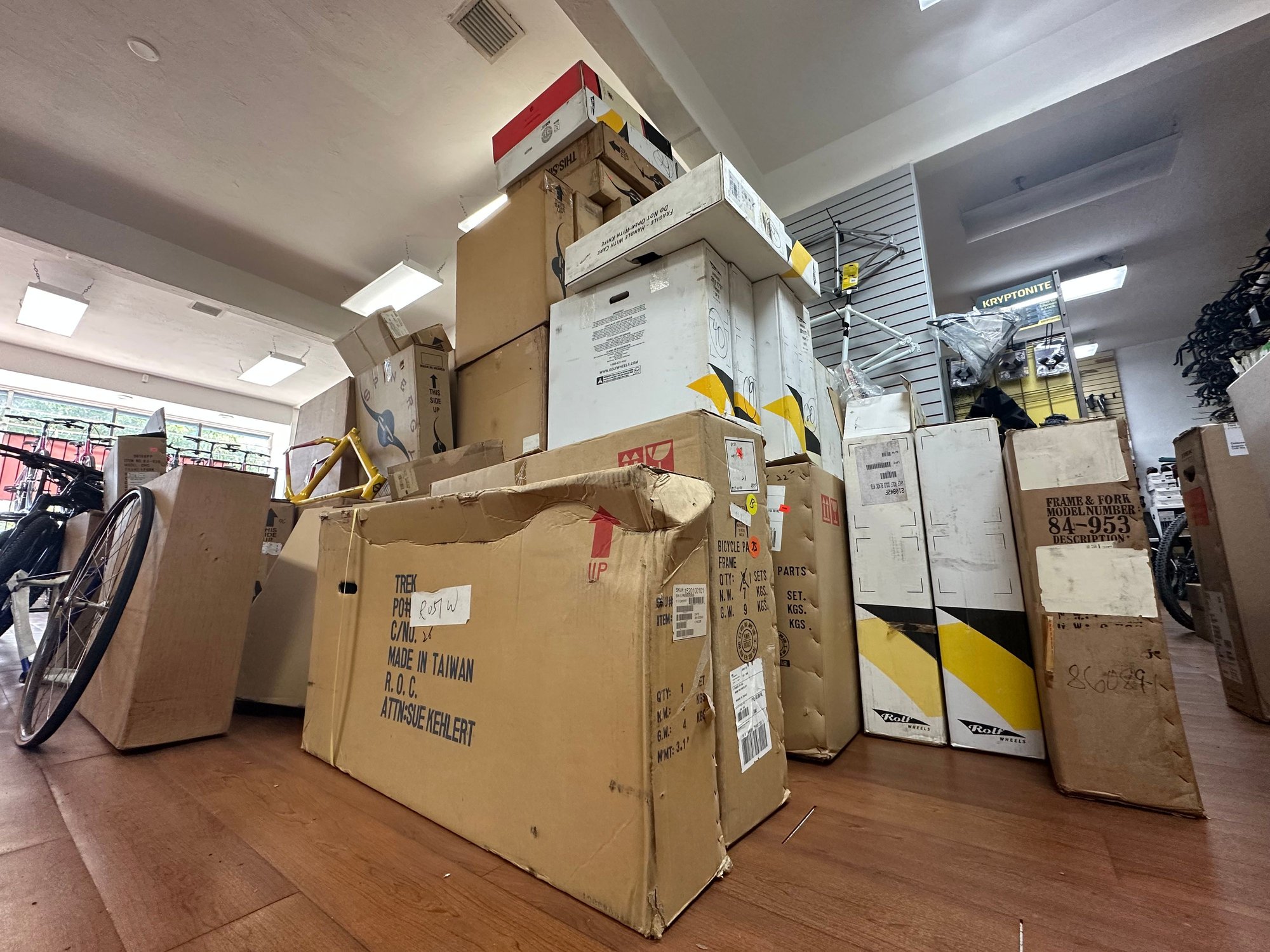 The Trek pile. I think there's another VW team replica frame in one or both of the boxes.