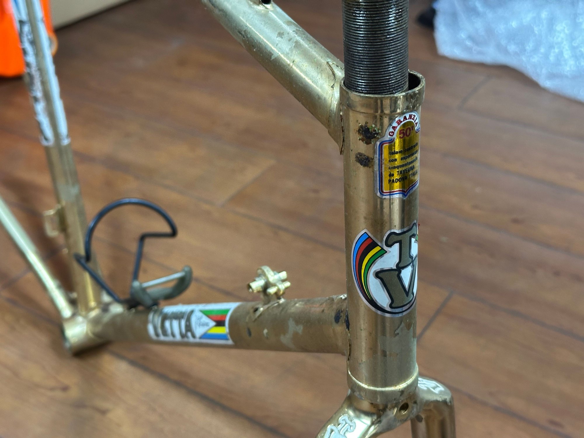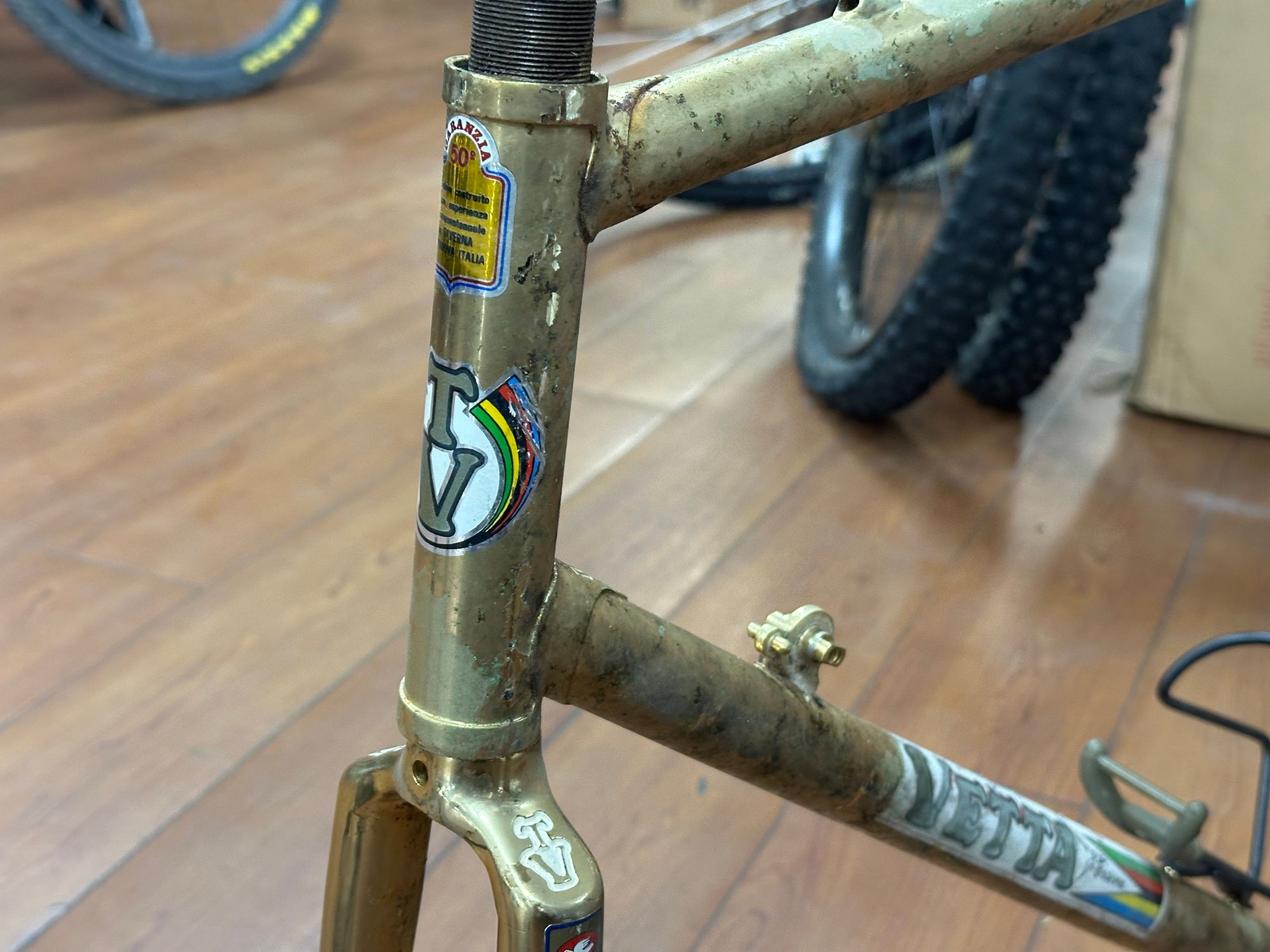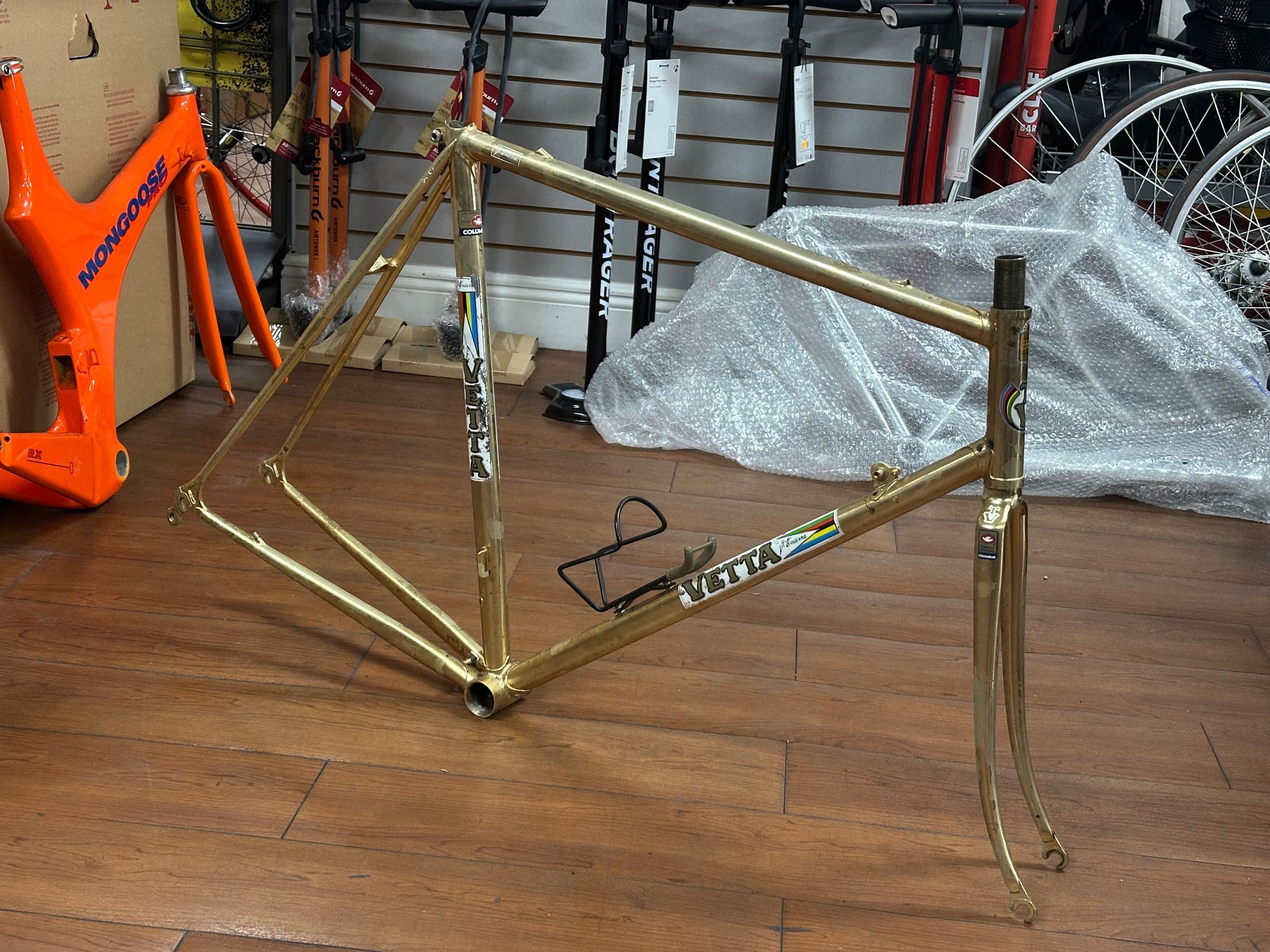 really convinced this Vetta is some kind of contract build by Benotto. It has the same tubing, internal cable routing, braze-ons and dropouts as a Benotto 5000. With all the other Benottos in the room, it stands to reason that this doesn't fall far from the tree.