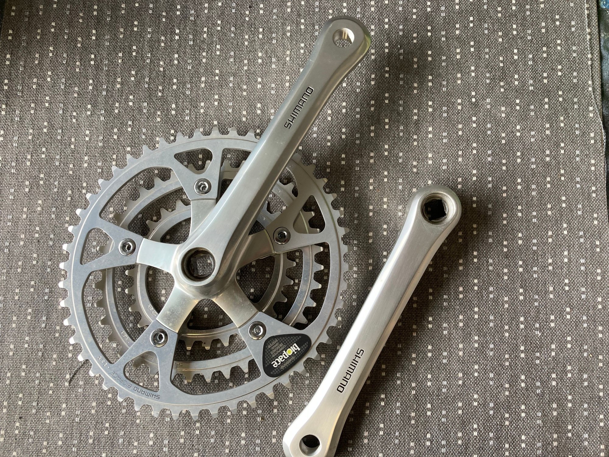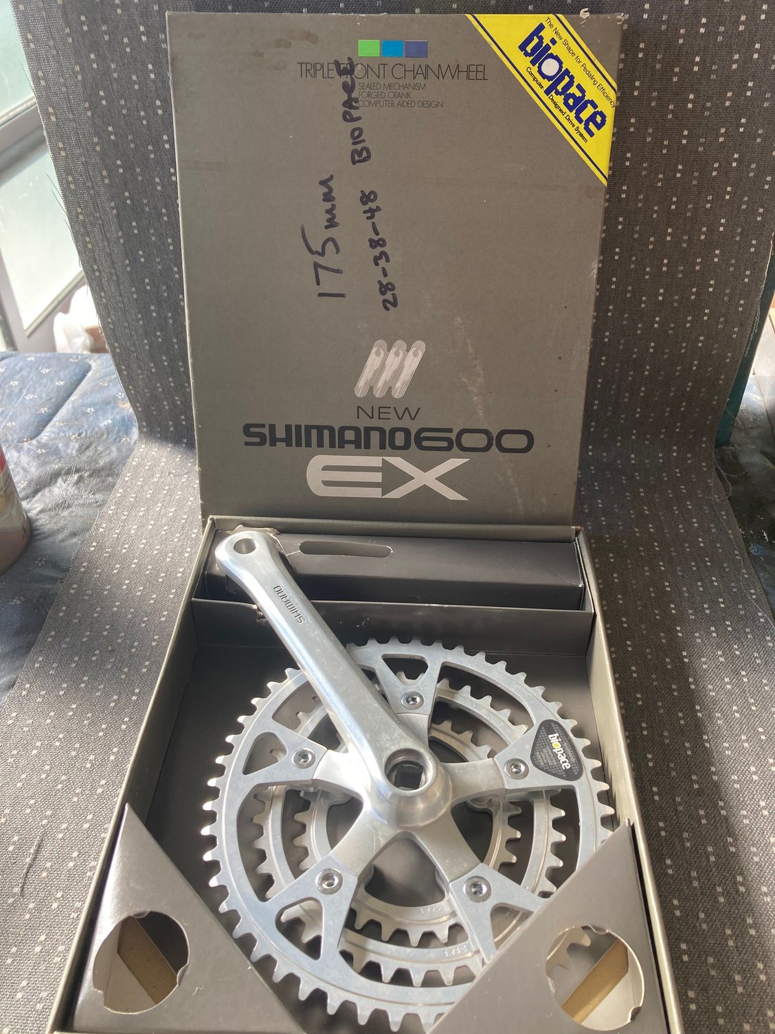 Paypal "family and friends." New Shimano 600 EX crankset. 175mm. 48/38/28. Residue on flats indicates that these were installed on a bike at one time but pristine chainrings indicate it was never ridden. No bottom bracket, no dust caps.