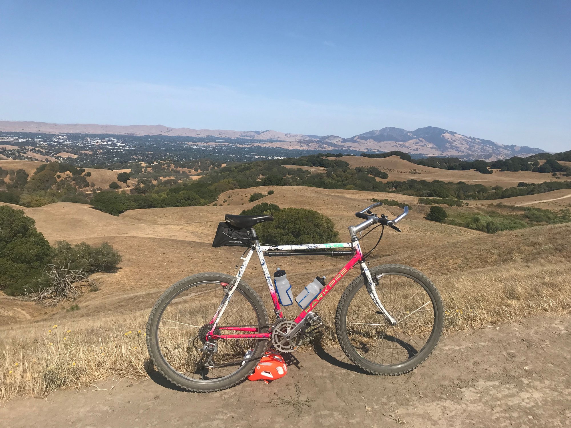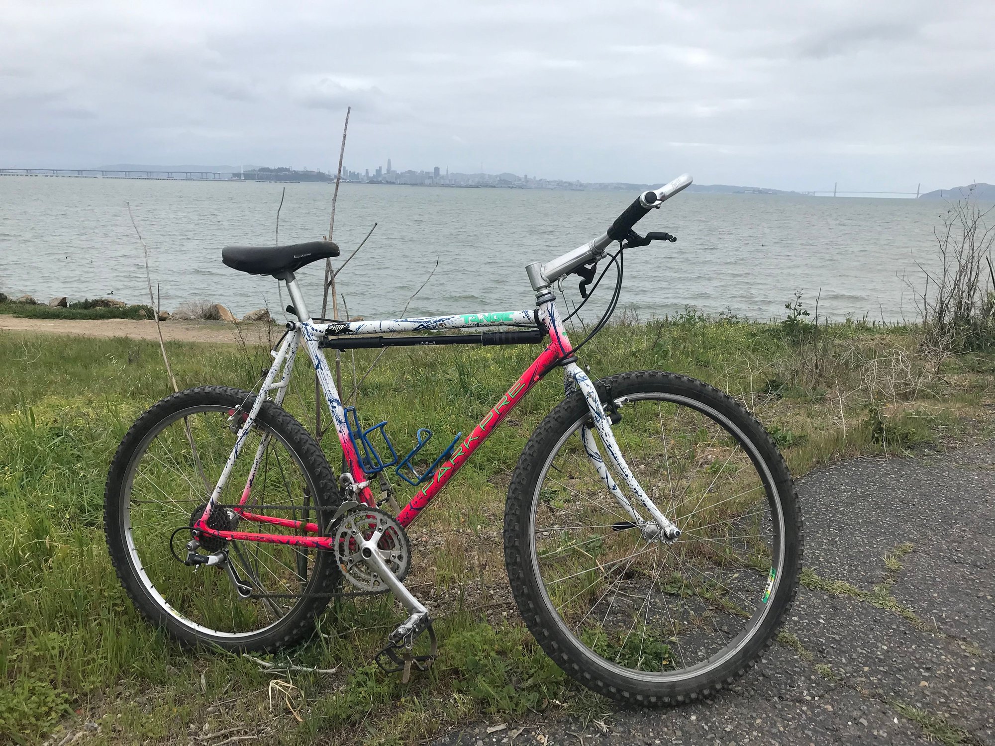 Many of the early Parkpre bikes, used a combination of fade and splatter paint that was popular in the late 80s/early 90s. I recall that Landshark had a few custom bikes in the style, and I always thought they may have been the inspiration. The first team bikes were pink and white fade with blue splatter. A couple years later, Shaklee became a sponsor of the men’s team and the colors changed to a blue/gray/yellow mix if I recall correctly.