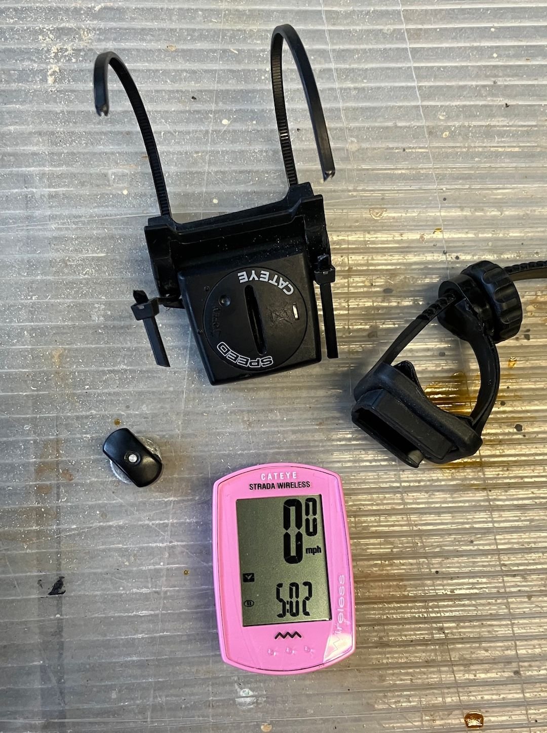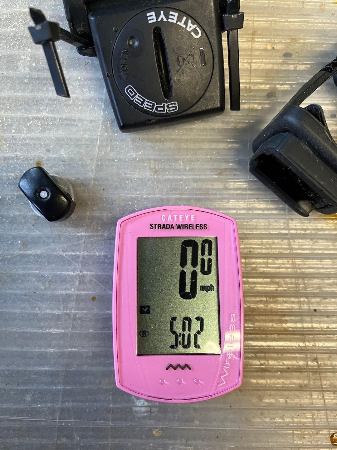 Tested off a bike and looks to work and have all needed functions but after snapping pix I removed the battery from the pink unit case cause it's default "sleep mode" is to keep running and display the clock.