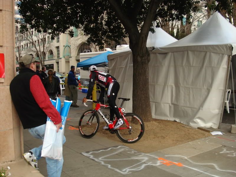 JJ Haedo casually rides his bike over to the anti-doping trailer.