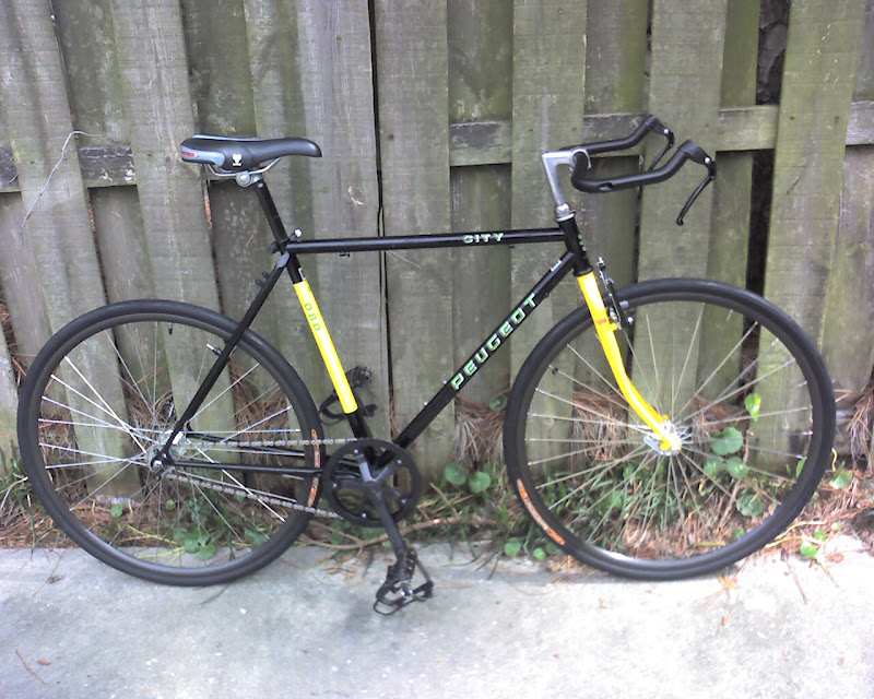 stolen 55cm peugeot "city" fixed gear / single speed (black frame, green lettering, yellow seat tube, yellow forks)