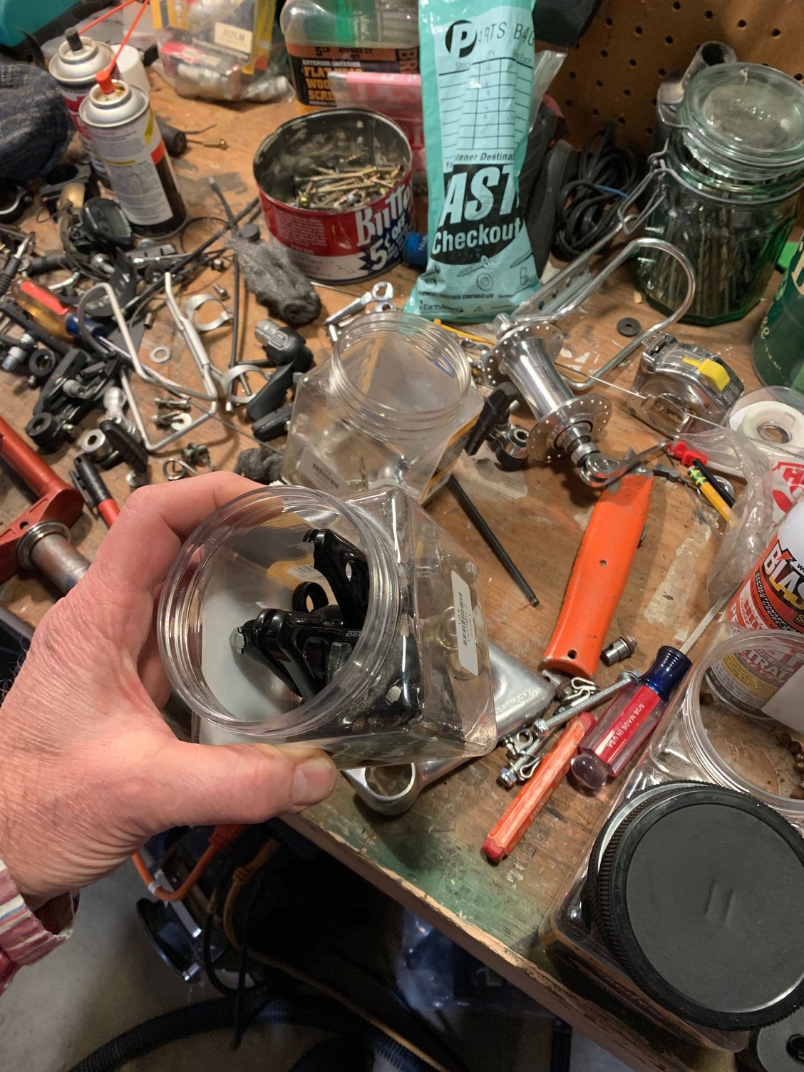 Unusual design called a cantilever caliper, requires three cables to actuate but uses no springs. |