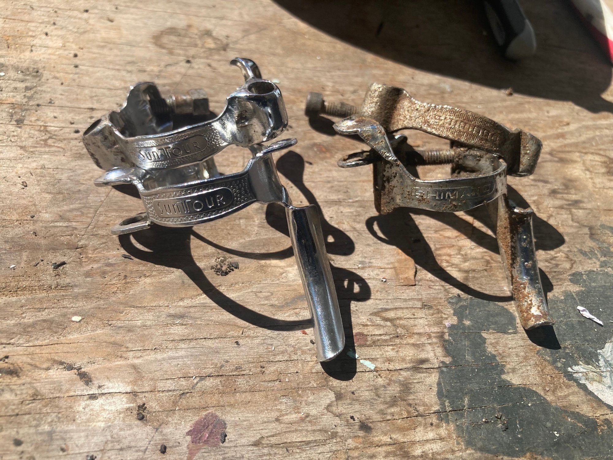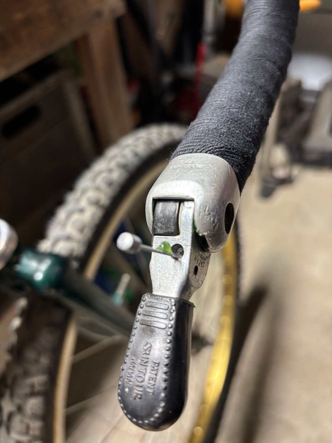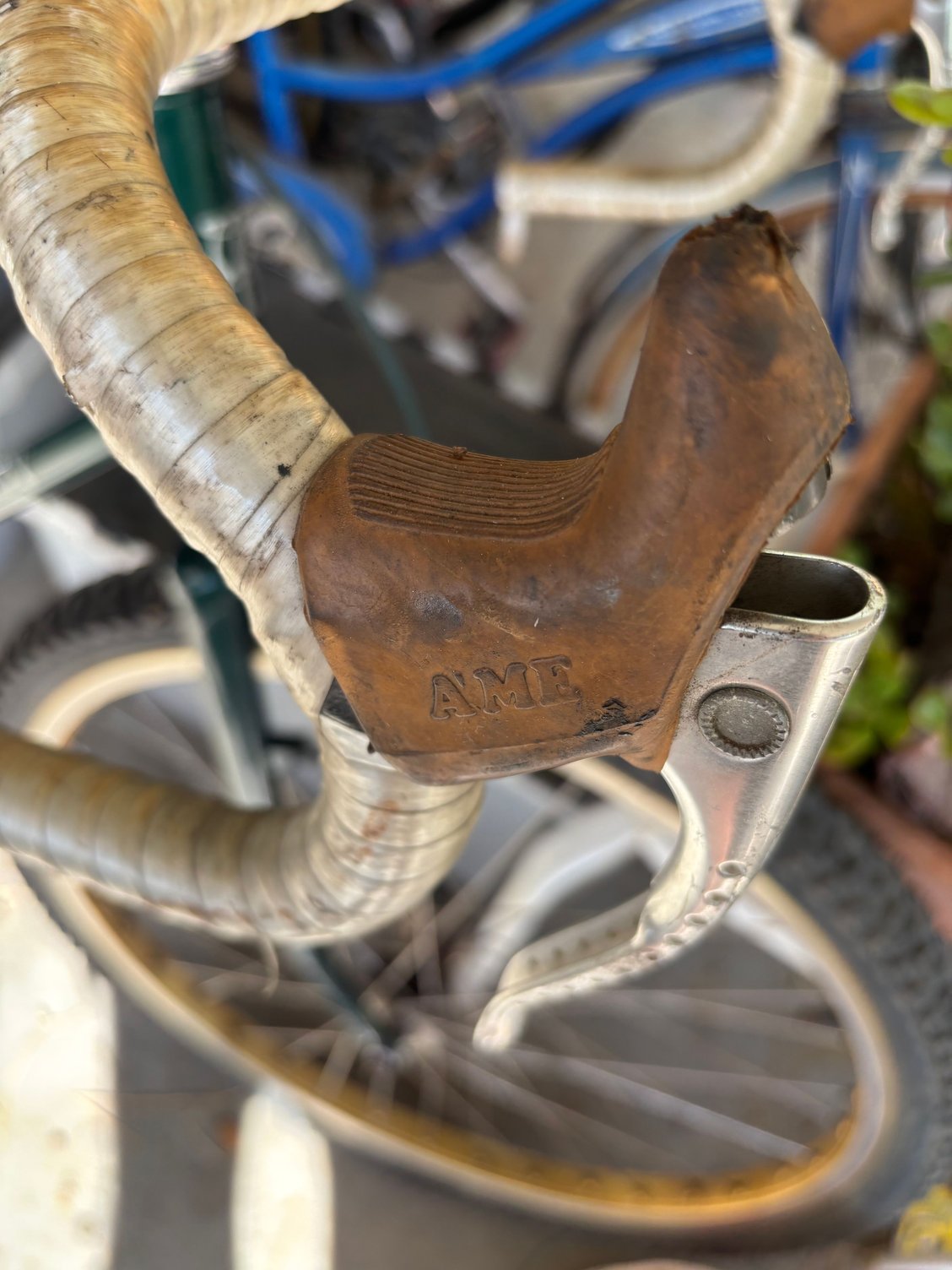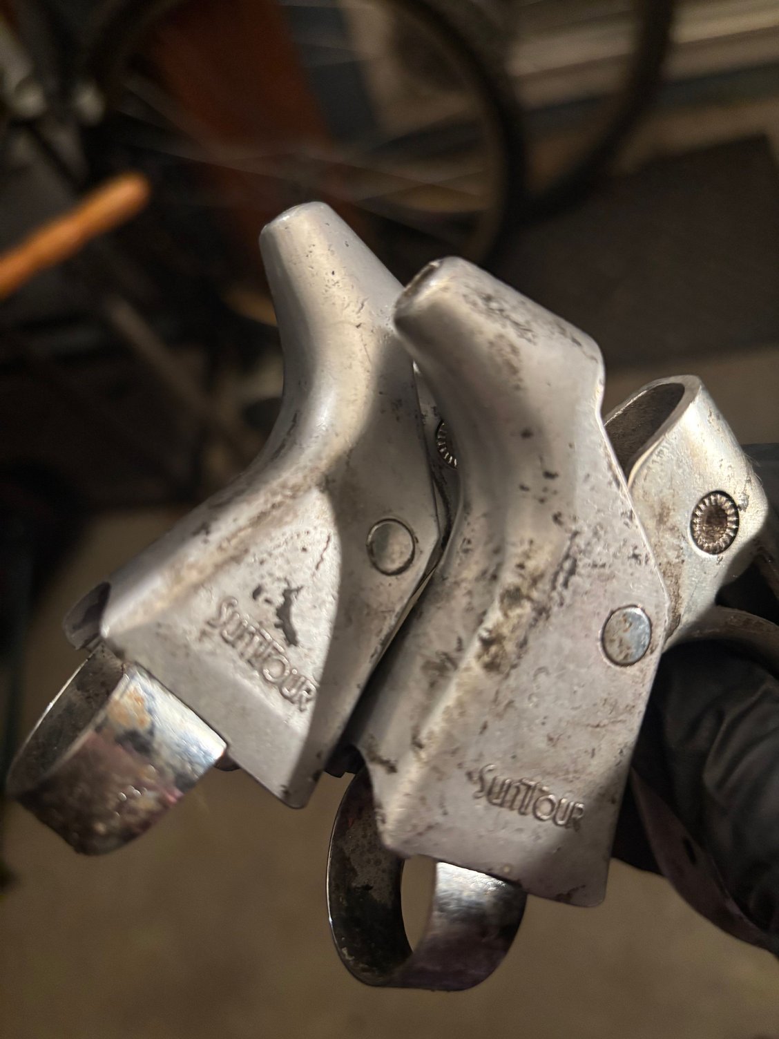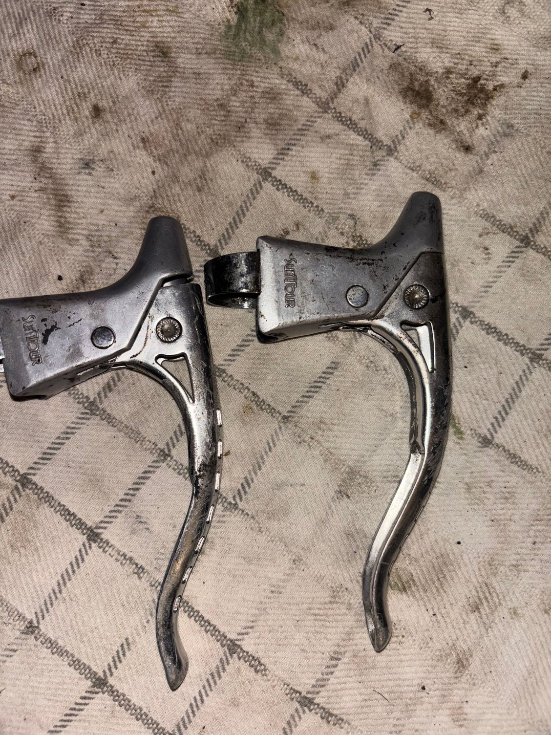The cockpit I wanted to use had a lot of oxidation under the old benotto tape. Because I like my smile and have no dental insurance, I decided not to risk it. These superbe levers are likely my longest hoarded parts. They are rashed real bad but they cleaned up nicely. Same with the other parts.