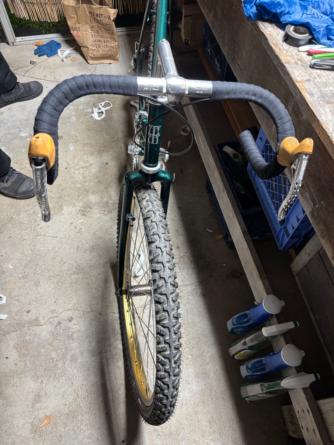 I had all the parts for the cockpit (bar, stem, levers and hoods) but did buy a set of newbaums taped the barcons. I like newbaums tape. Plus I buy from Rivendell. I get to support a local bike business that I think is cool. The suntour bar end shifters were a FB marketplace find. The threads had some old grease on them so were a little sticky. Some simple green and new grease and they were ready to go! Total steal at $20. I feel silly about not getting a picture of them cleaned and greased.
