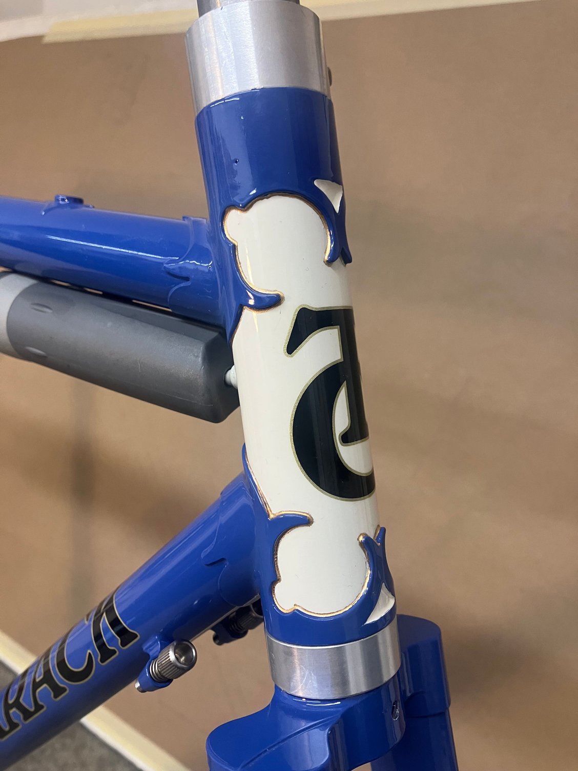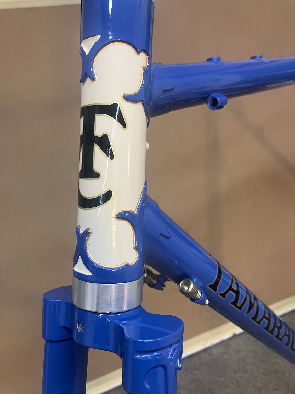 I just finished painting a new custom frame that I built this month for a fellow in British Columbia, using a set of 1950’s Oscar Egg lugs and a similar age Ekla fork crown. Came out kinda nice, I think.