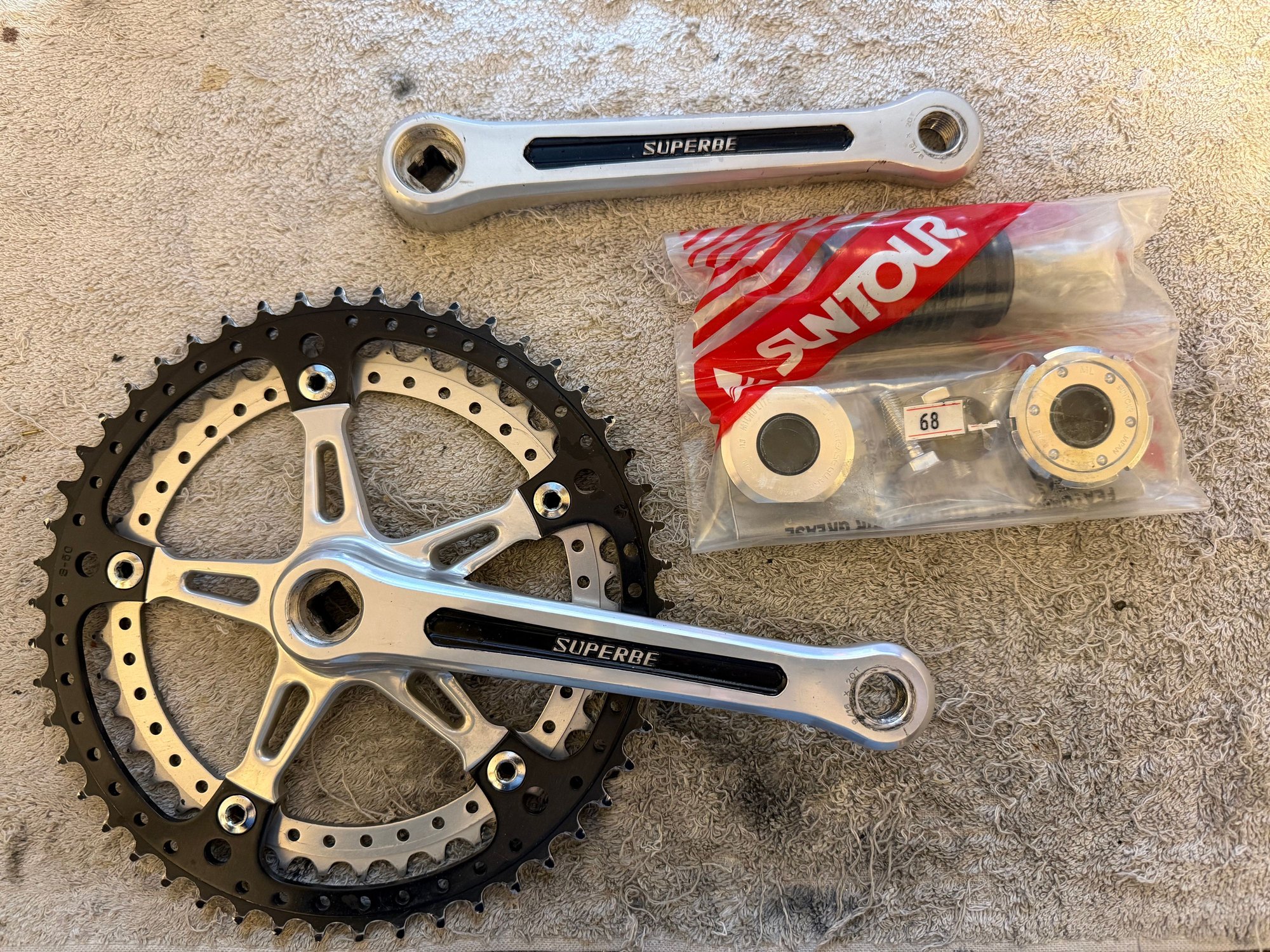 I don't like the Suntour Le Tech and Sugino triple crank, they are a bit overkill for this bike, and I wanted to use the Crane/Dura Ace components. I got this Superbe crankset, the black goes better with the the other components, and I found a new Micro Lite bottom bracket to go with it.