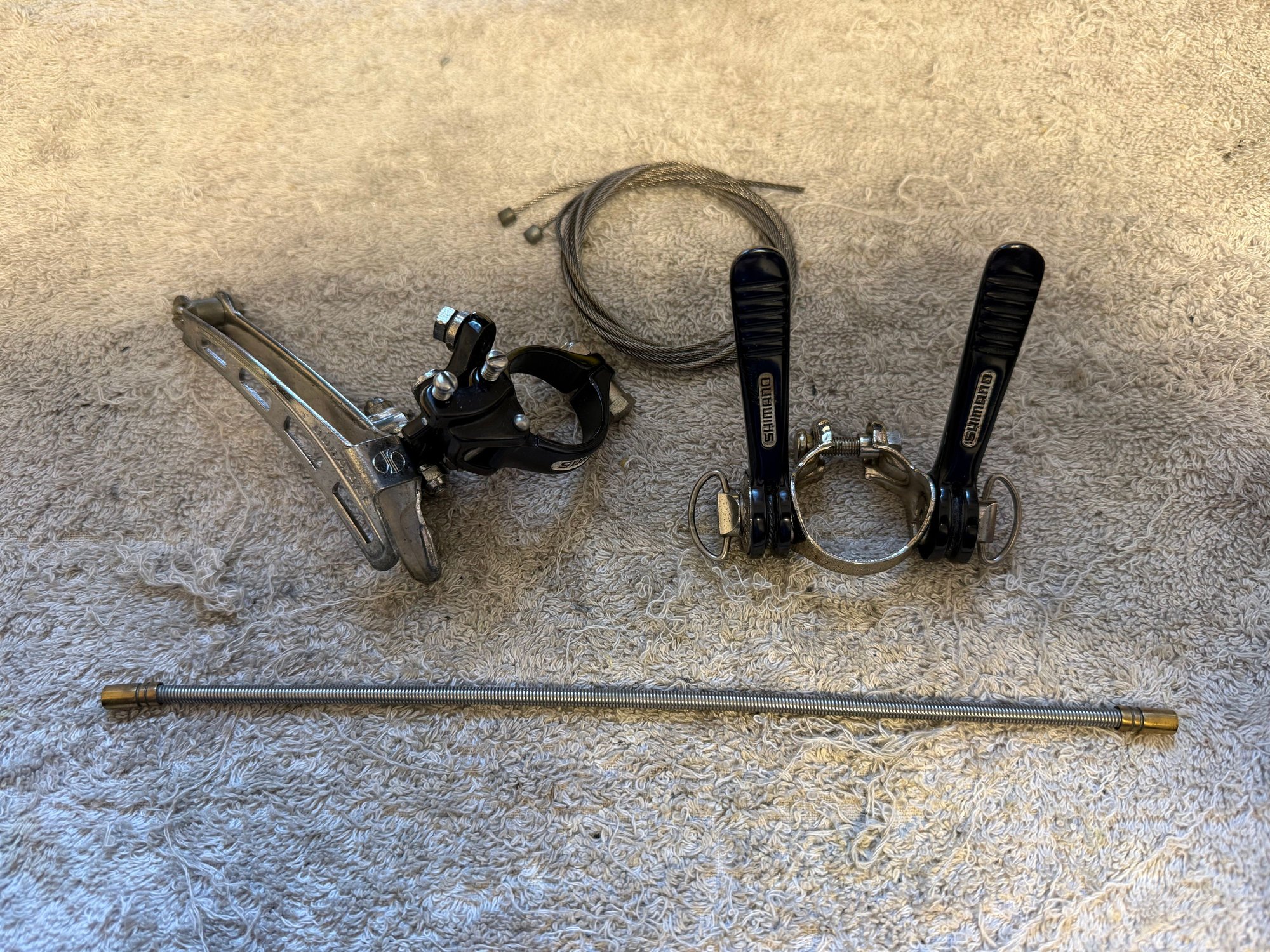 I will eventually install the Dura Ace 7100 parts, which will match the hubs. I found a medium cage to put on the Crane derailleur, and a 26t cassette. I also have a Suntour Superbe black and silver crank set, but am waiting on the correct bottom bracket.