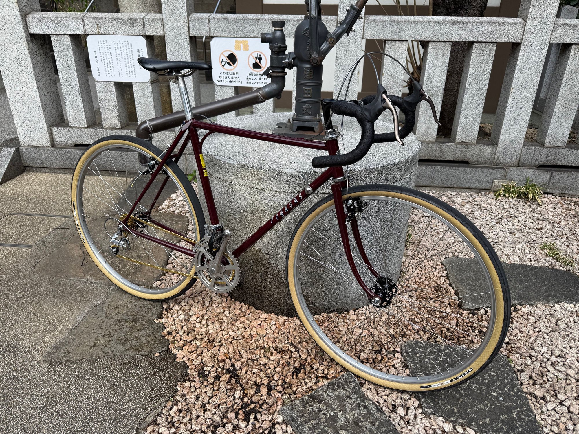 The seatpost is a Suntour Superb NJS model, the headset is a Tange "Rinko." If the v brakes work out, I'll swap that out the Tange for the Dura Ace 7100. The bike is running an Ergon saddle until I get another B17.