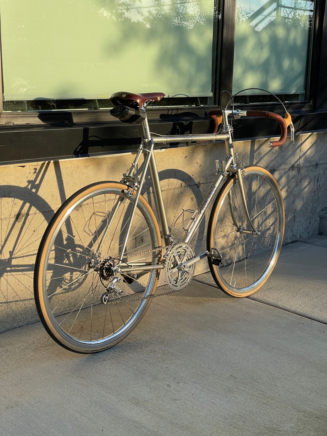 The wheels have 36 spoke Araya 700c rims, Suzue hubs. And 28mm tyres which are probably not 29yrs old but could well be.