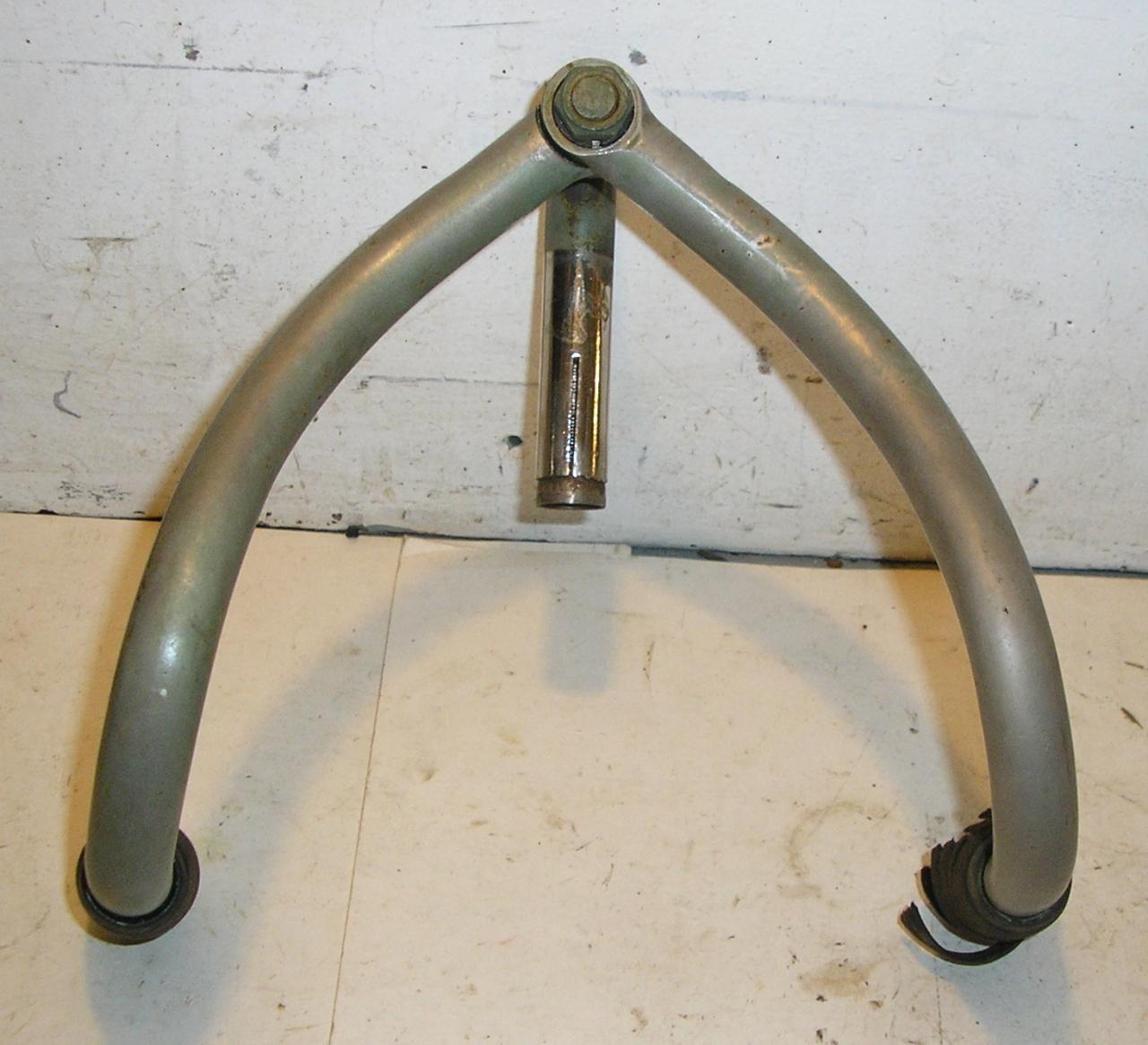 Those saddles were known as "hygienic" for some reason. The hub is a Morrow. I think this bike is just getting some basic repairs and clean-up and some corrosion protection. I am sure this bike could be ridden but I am sure not going to suggest such a thing. The handlebar is a "Fredrick adjustable" the cranks are Fauber (I suspect), the rubber things are known as "buffers" and are placed where frame damage might occur.