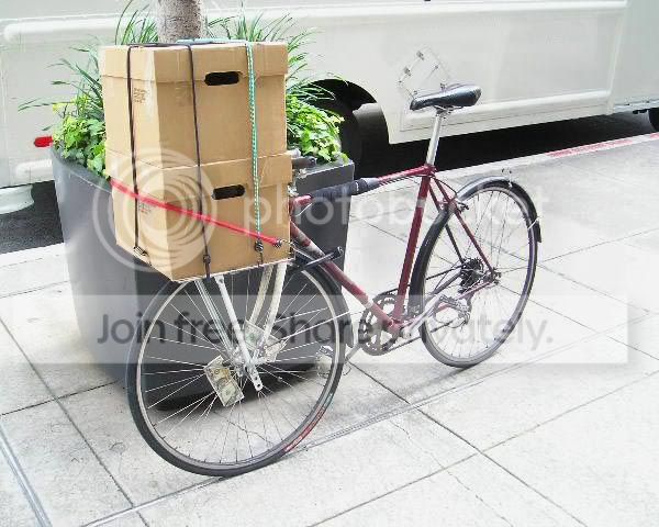 Long before I came along, bike messengers in SF have been modifying thier Wald baskets into a more versitile platform. For years, they've cut away the sides and front from the basket and bent back the sharp edges to make an "L" shaped carrier. As you can imagine, the result is a lighter and more maneuverable "rack", which is also better suited for carrying oversized boxes. Problem is, they're kind of flimsy and crude...but they do the job.