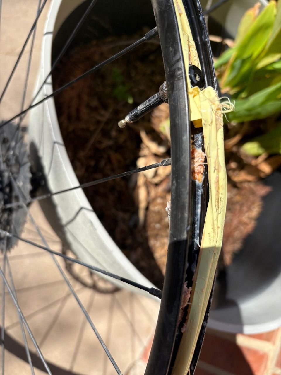 My overall experience with tubeless has been positive. It doesn’t prevent work on the tires, but it moves the work home. I almost never get a puncture of any kind. But the tape and sealant neither last forever. When tape goes bad, it leaks into the rim and compounds problems. I had something else written up before this, but I deleted it all because I thought I had better live my truth, and go check on my bike, which has been not holding air for an entire ride time lately. And I could tell it had sealant because I could hear it sloshing.