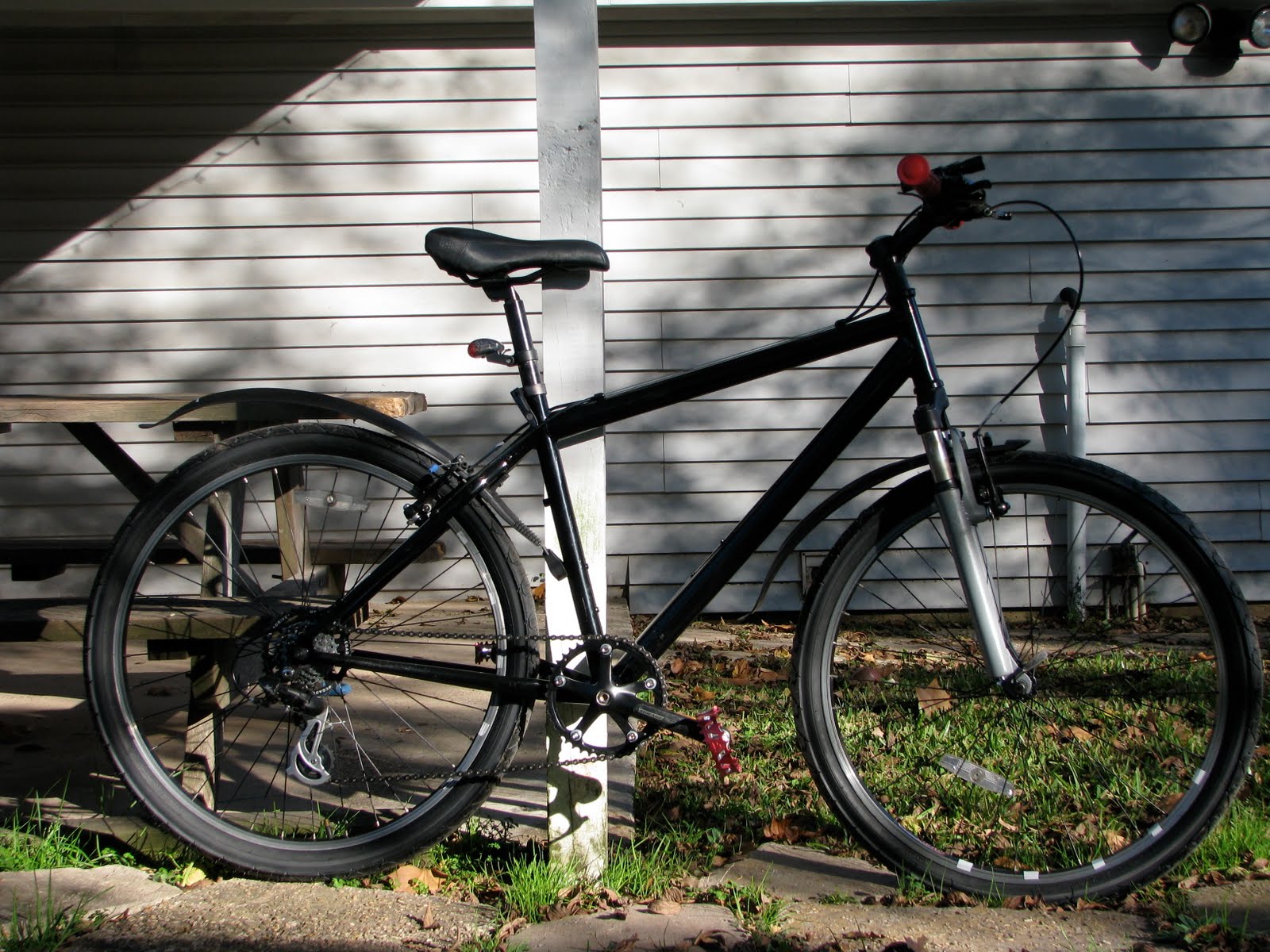 Bike is (probably) an old steel StumpJumper that I acquired at a veloswap long ago, nearly as-is. Singlespeed 44x16. Commute is 3.5 miles, 95% street, with a college campus, 5 days a week. Door-to-door is faster than the same commute by car, due to parking. |