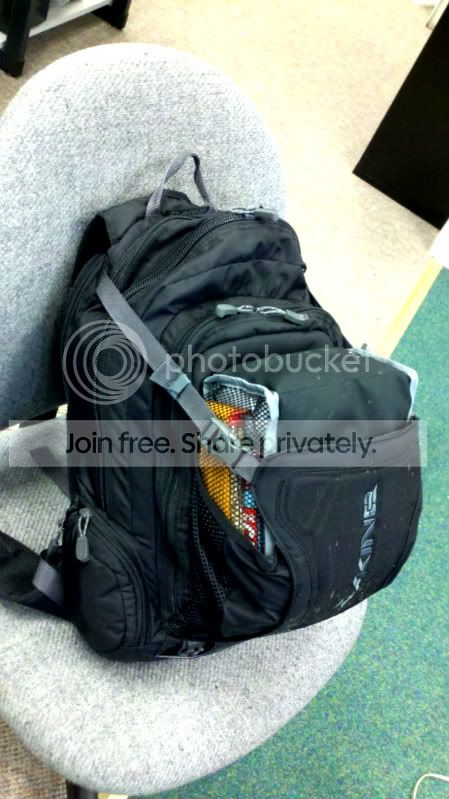 I took some pics of the Dakine Apex when I got into work. It's like a freakin' clown car. Small, but holds a wicked amount of stuff. All of my work tools, laptop, full change of clothes, breakfast and lunch, first aid kit, tons of electronic doo-dads, umbrella.