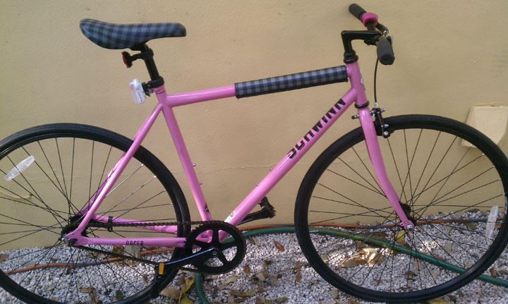 whilst i was riding home yesterday i stopped at a crossing and noticed a pretty unique bike pull up beside me. bright pink, stripped down to the bare bones just like a fixed gear. nothing special i thought, there are plenty of single speed bikes here that are designed to look like fixed gear bikes.