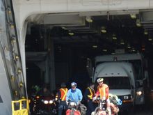 Large, fully-faired touring motorcycle with luggage strapped everywhere.