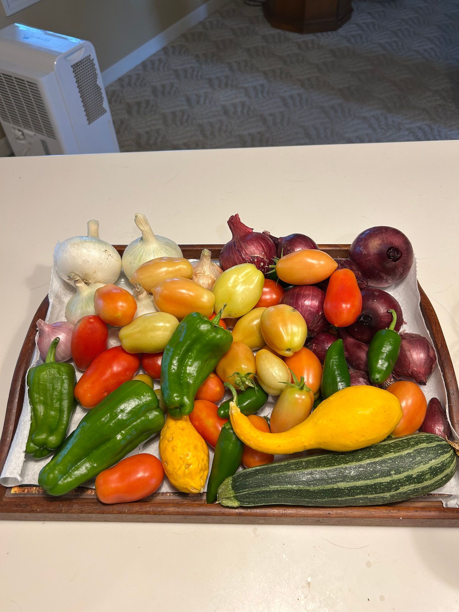 Garden doing ok, here is some of the harvest. I have a basket full of onions drying out by a fan. In about a week the tomatoes 🍅 will be coming in mass.