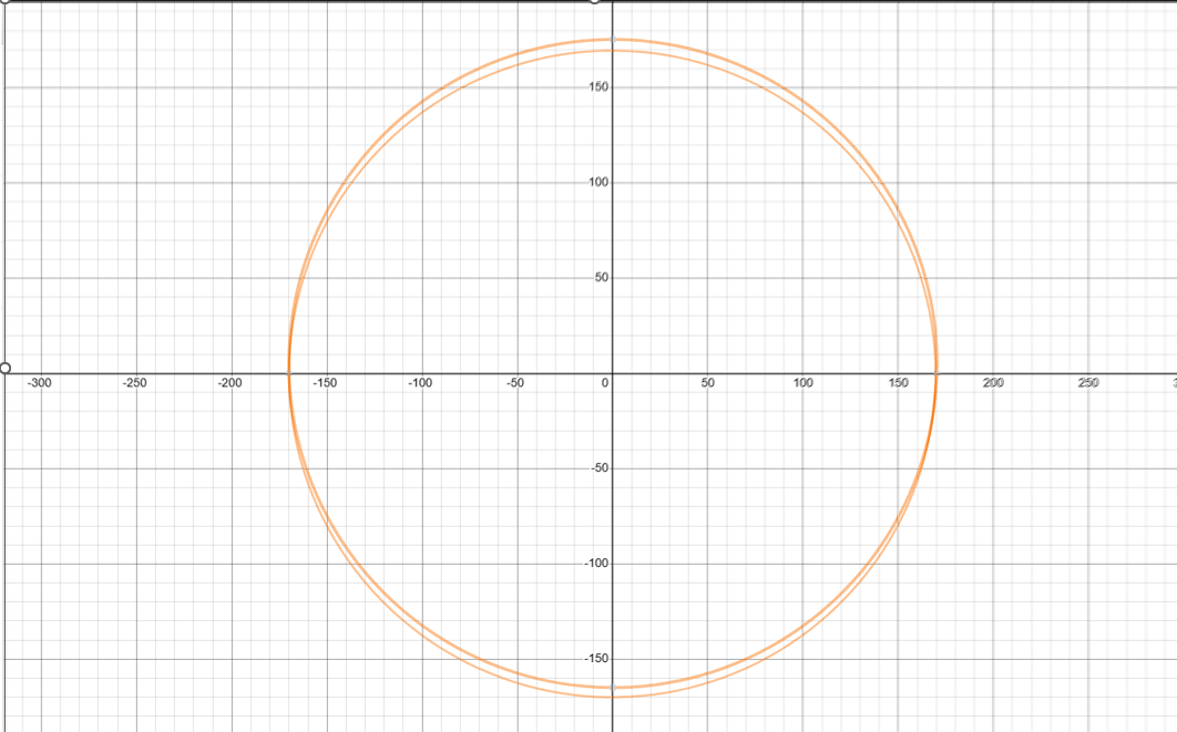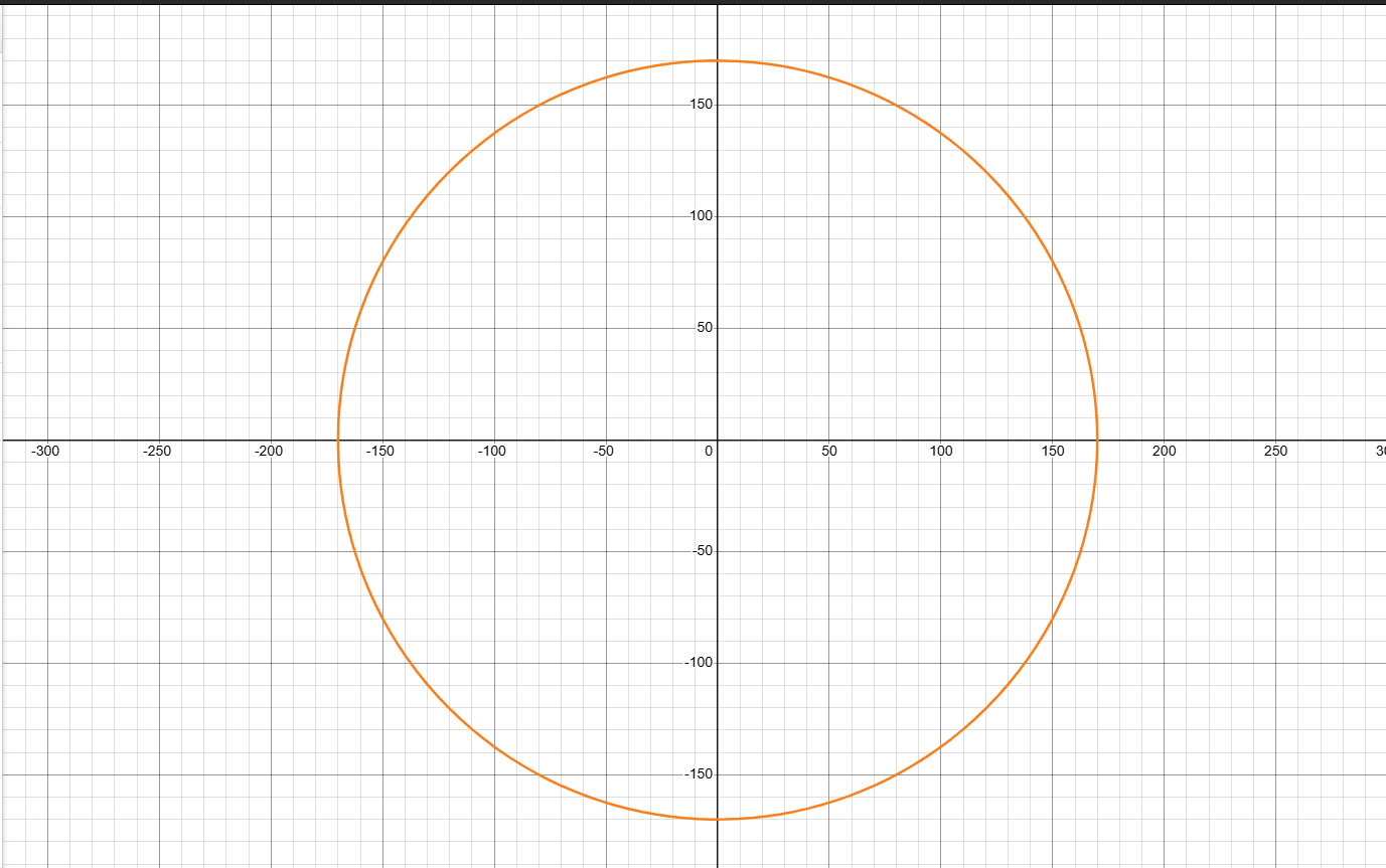The formula for a circle is (X - H)^2 + (Y - K)^2 = R^2, where R is the radius, H,K are the coordinates of the center of the circle - the BB center in our example, and X,Y are the coordinates of any point on the circle - the position of the pedal spindle. So, if we set H and K to 0, that puts the BB center at the origin. Here's what you get with an R of 170: