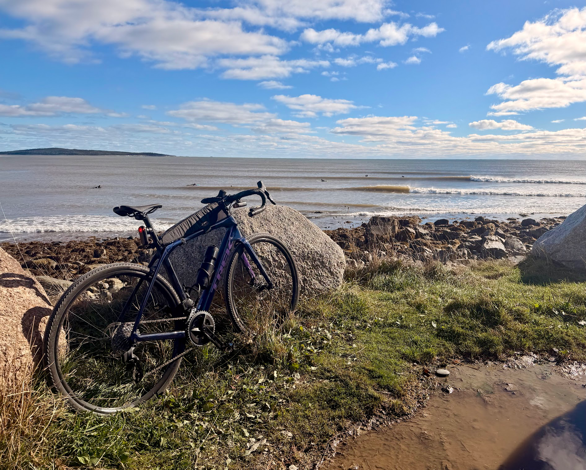 Oct. 21, 2025. Lake Michigan in the background, as seen from Sheboygan, WI. I had just ridden through the tail end of that storm off to the left to get to this beach.