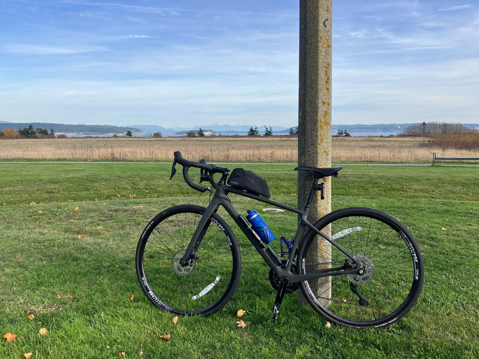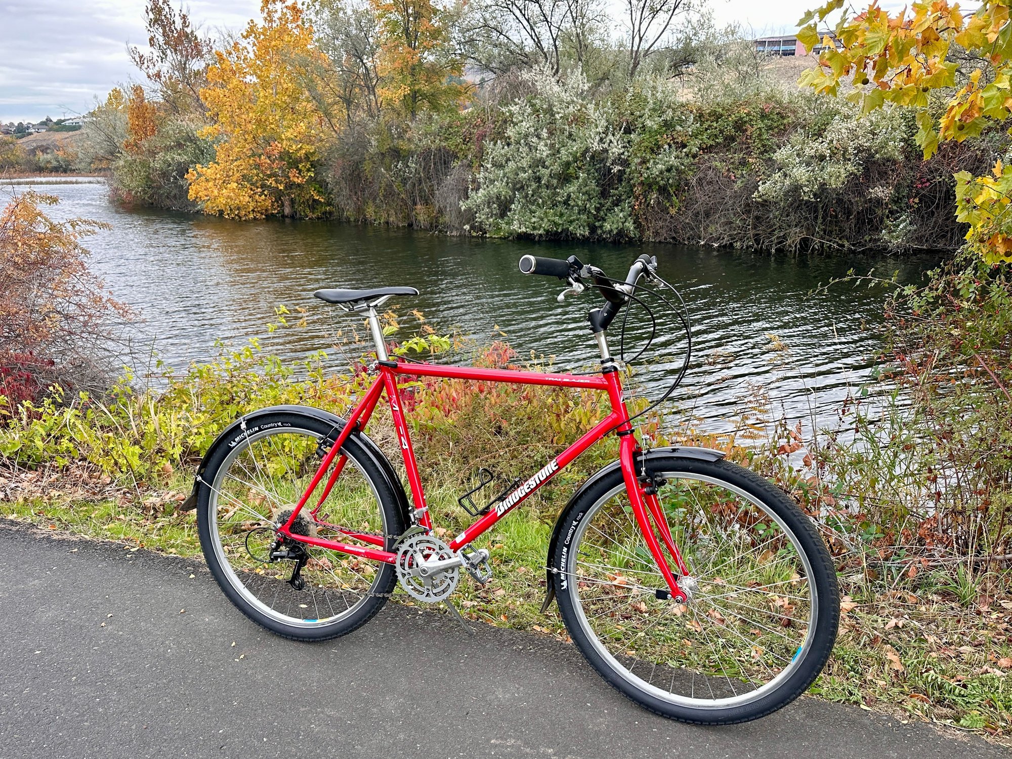 This mixte bike makes for a very nice mixed surface ride. In the picture the tires are GK semi slick 32mm. I usually have 38mm Bontrager AW3 tires on the same wheels. The wider tires are considerably better in the rougher off road/gravel areas.
