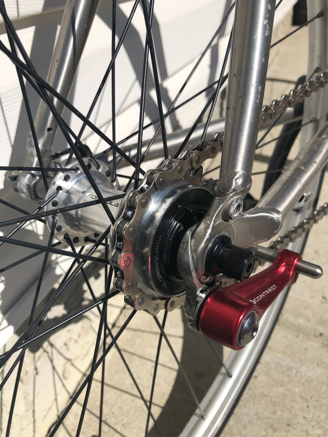 Gear: 42T/17T - rebuilt the back wheel (after breaking a spoke) to achieve a good chainline with dish.