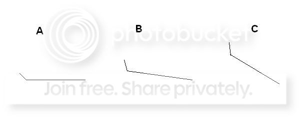 Just wanted to get a feel for how people have their bullhorns angled on the FG/SS bikes. I recently switched to the 'horns because the frame that I converted was a little short in the TT, and I like a more stretched out riding position (I hardly ever rode out of the drops). I have started developing a little bit of hand pain, only in the palm of my right hand, in that pad where the thumb joins the hand. I noticed that my horns had slipped down in angle to where they were below parallel to the road. I moved them back to a slight angle (B) and really clamped them down this time. My hand still hurts but it could be residual from the sub-A position. HAs anyone else played with angles to eliminate pain, or will I eventually go back to drops?